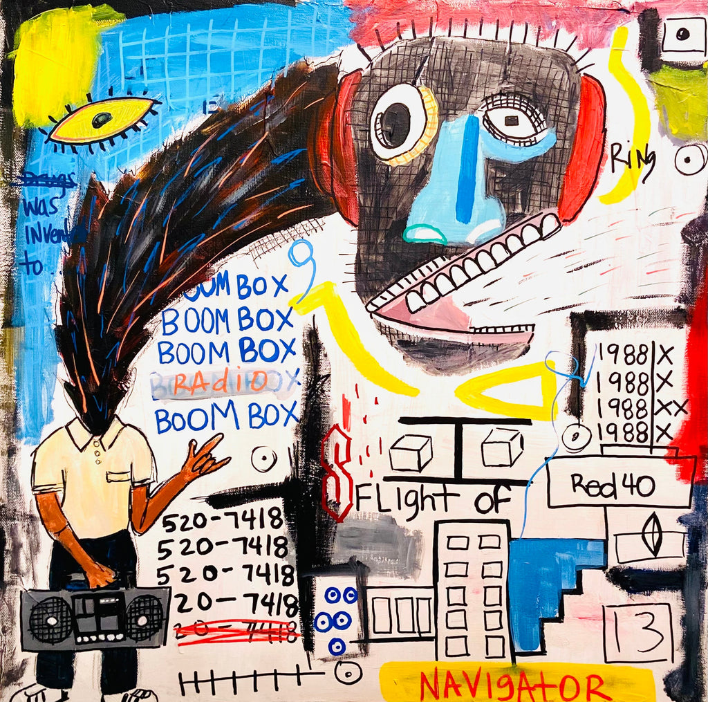Much of Samosa’s work is inspired by the late 1980’s street artist Jean- Michel- Basquiat. Her work often incorporates cryptic text such as “ring” & “lo@k”, as well as angel numbers, into the margins of her composition. The graphic patterns and bright color palettes are used to command the viewers attention, as a DJ would her audience.
