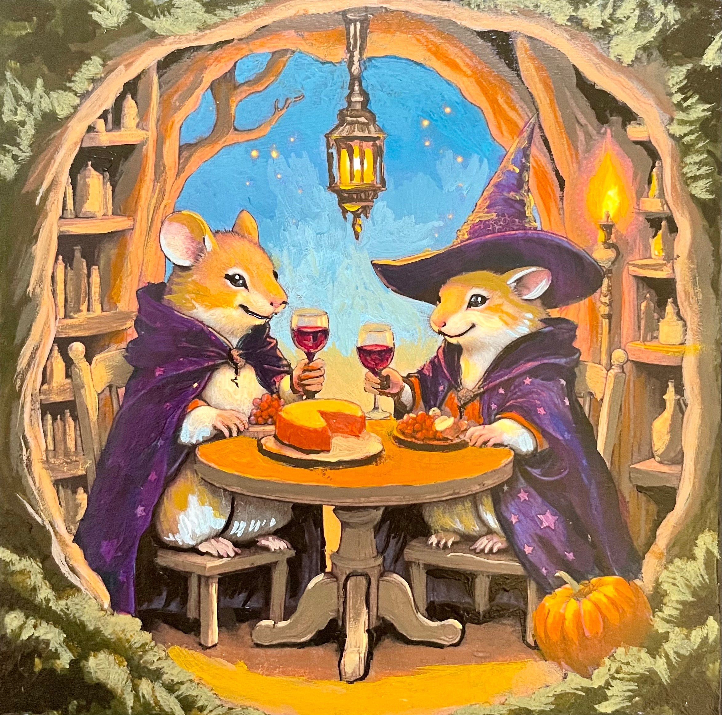 ”The Witch’s Apprentice is a series that follows a small hamster taken in by a woodland witch, who nurtures him in the ways of magic. In these paintings, the apprentice learns to brew potions, ride a broom, and wield spells against formidable enemies. Amid the dangers, there are gentler moments: shared lessons, fireside warmth, and the discovery of friends. It is a fairy tale of growth and independence. While the imagery is whimsical and at times perilous, the deeper thread speaks to the resilience of curiosity, the vulnerability of learning, and the power of friendship to soften even the darkest landscapes. Magic is another word for perseverance in the face of fear and a light given flame through connection.”