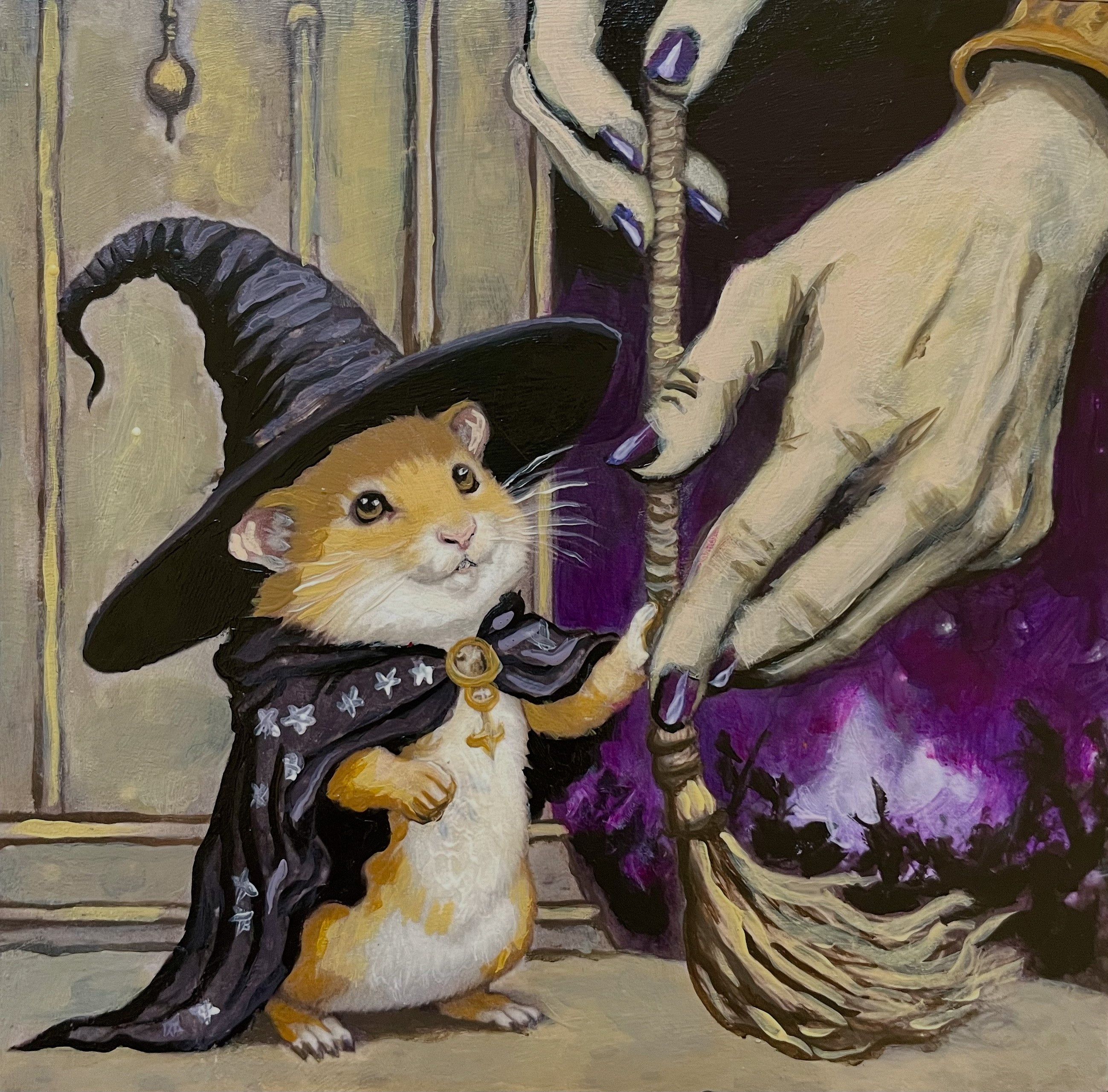 ”The Witch’s Apprentice is a series that follows a small hamster taken in by a woodland witch, who nurtures him in the ways of magic. In these paintings, the apprentice learns to brew potions, ride a broom, and wield spells against formidable enemies. Amid the dangers, there are gentler moments: shared lessons, fireside warmth, and the discovery of friends. It is a fairy tale of growth and independence. While the imagery is whimsical and at times perilous, the deeper thread speaks to the resilience of curiosity, the vulnerability of learning, and the power of friendship to soften even the darkest landscapes. Magic is another word for perseverance in the face of fear and a light given flame through connection.”