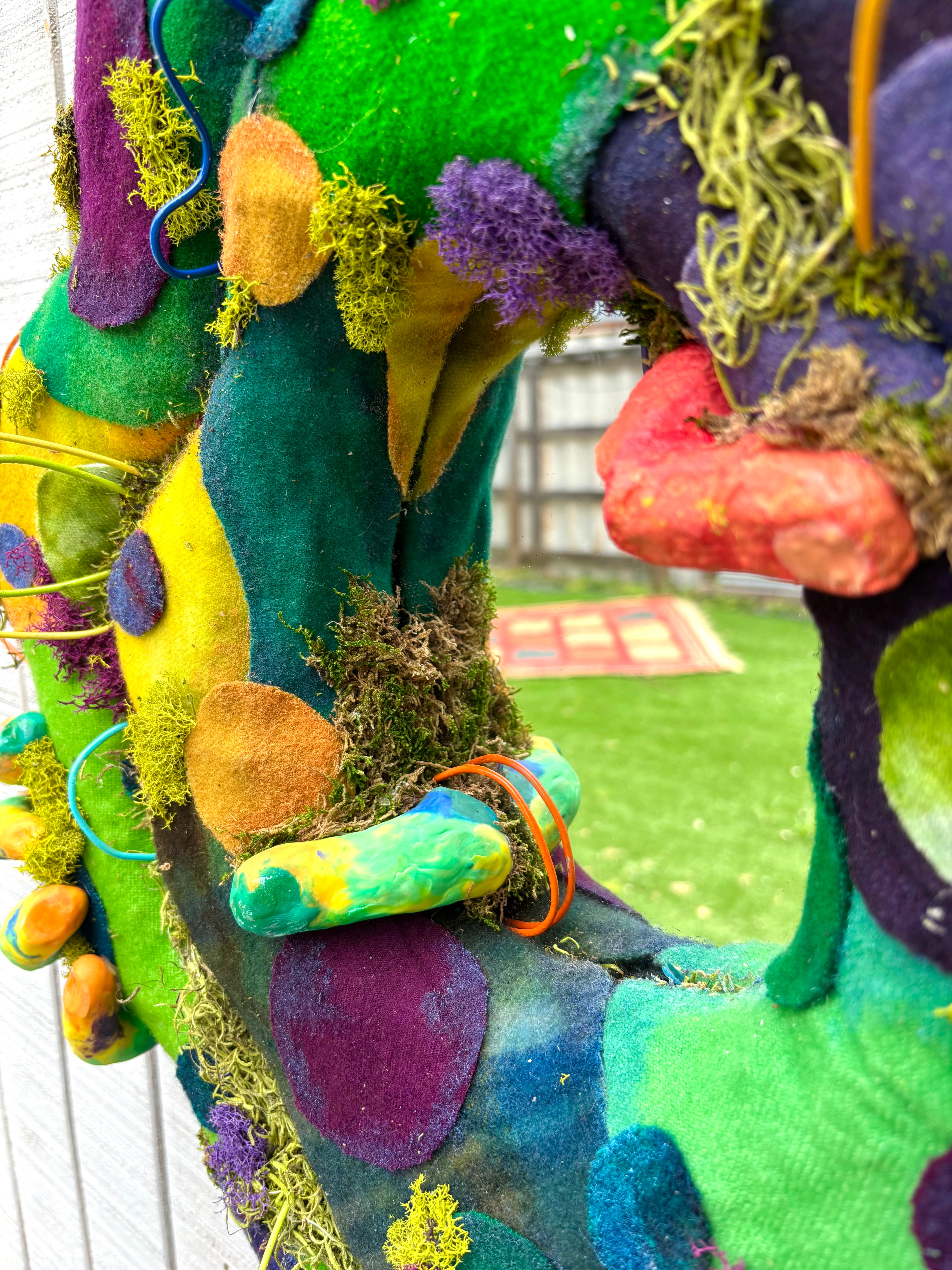 Made using: Fabric scraps, preserved moss, foam, paper maché, polymer clay, mirror, marble ball, wire and mixed media paints.