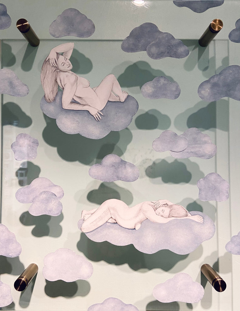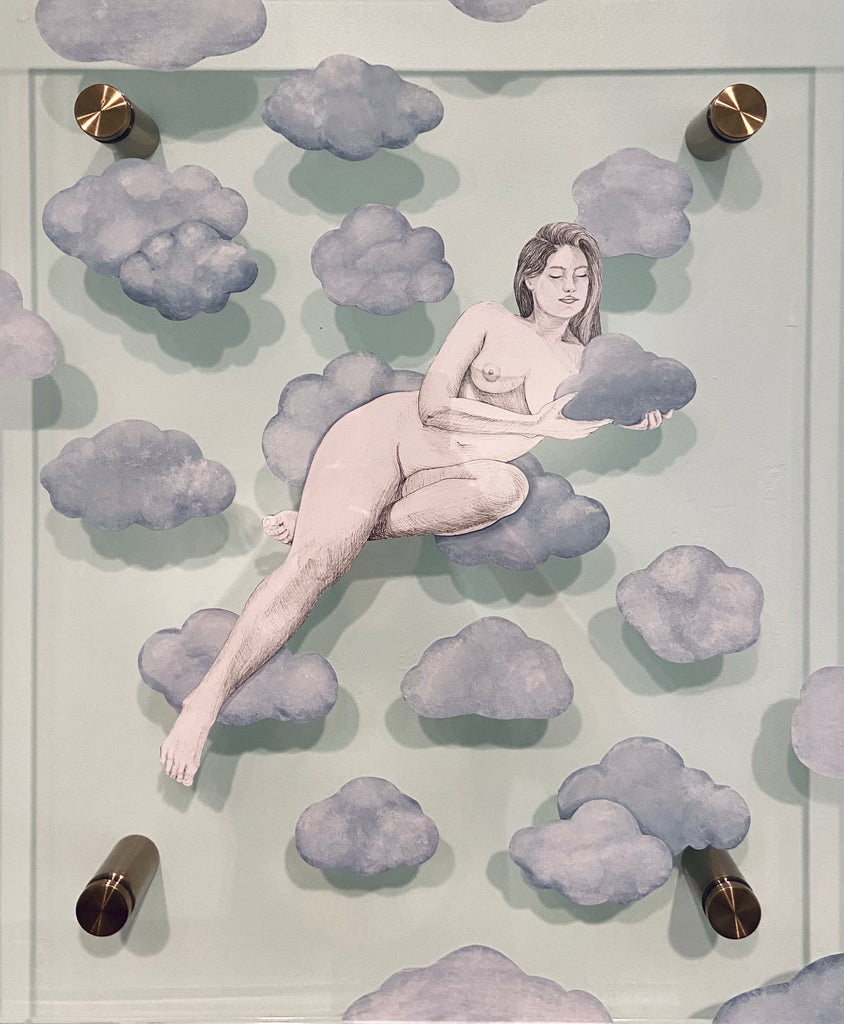 Erwin’s subjects are finely drawn with nimble precision, yet emanate a quiet power that is difficult to capture. The artist delicately cuts out all her figure drawings, freeing them from the anchored space of the paper, and lastly arranges them between layers of transparent acrylic glass. In cutting figures out of an environment, they are recontextualized in a minimalist composition, which has the resulting effect of floating atop the surface they are hung on. In the final stage of her process, Erwins designs a surface pattern from her original artwork which is then printed on fabric & sewn into handmade goods.