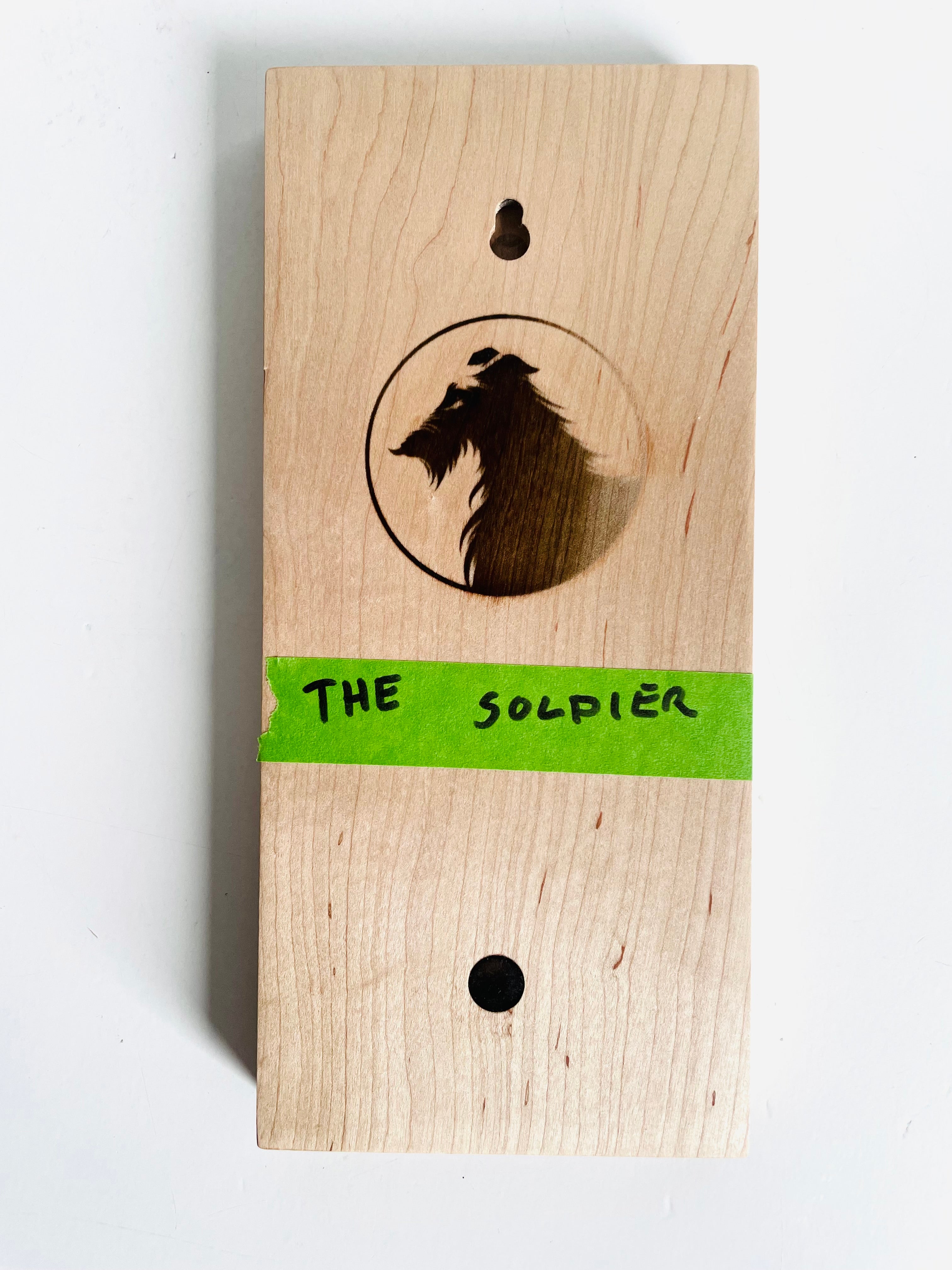 Encased in resin is a tuft of hair from his dog, Sullivan, the Irish Wolfhound. This is a genetic signature, substantiating the work as a Brandon Kells Original.
