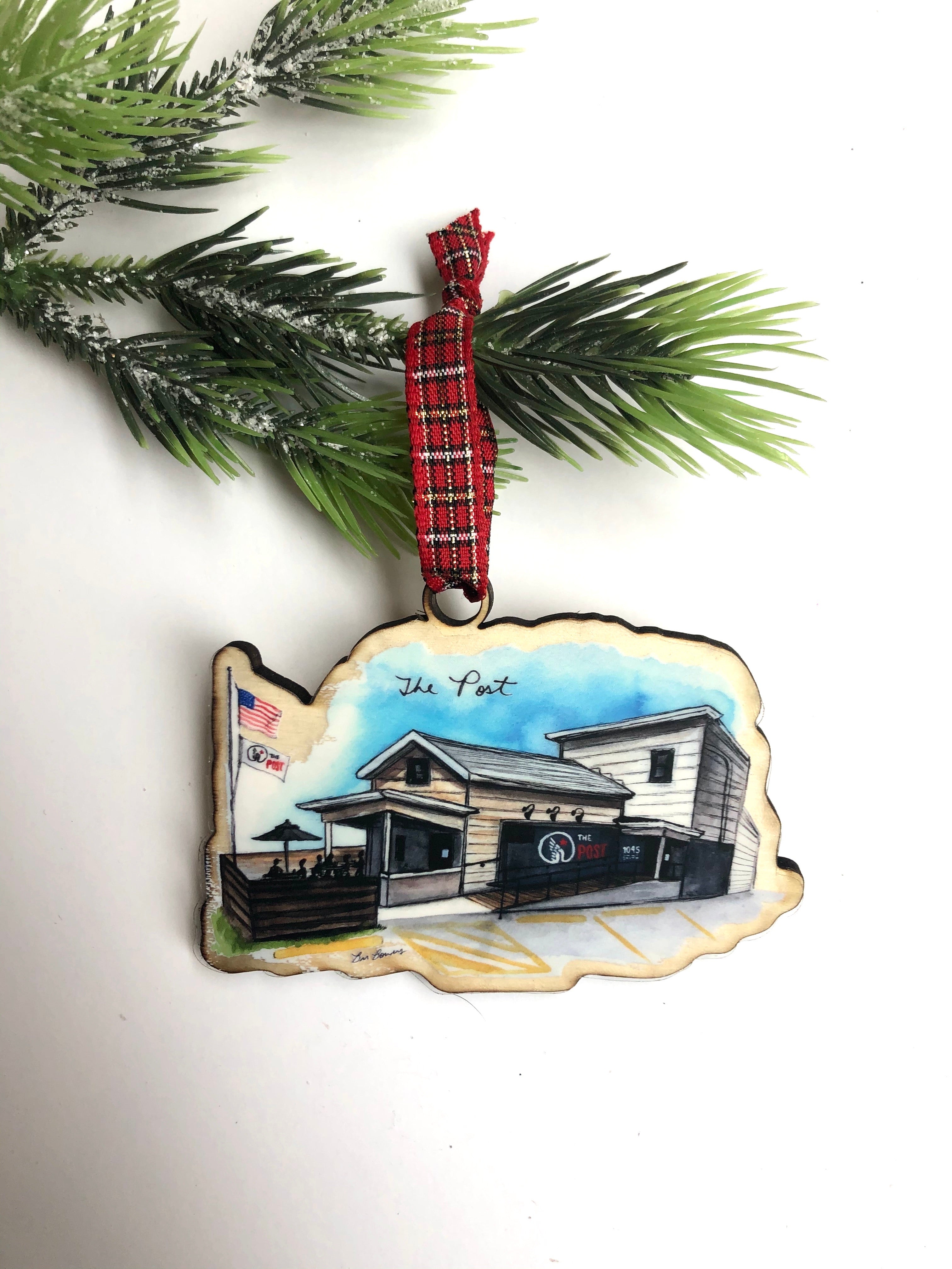Wooden Laser cut & watercolor illustrated ornaments by local artist Bri Bowers