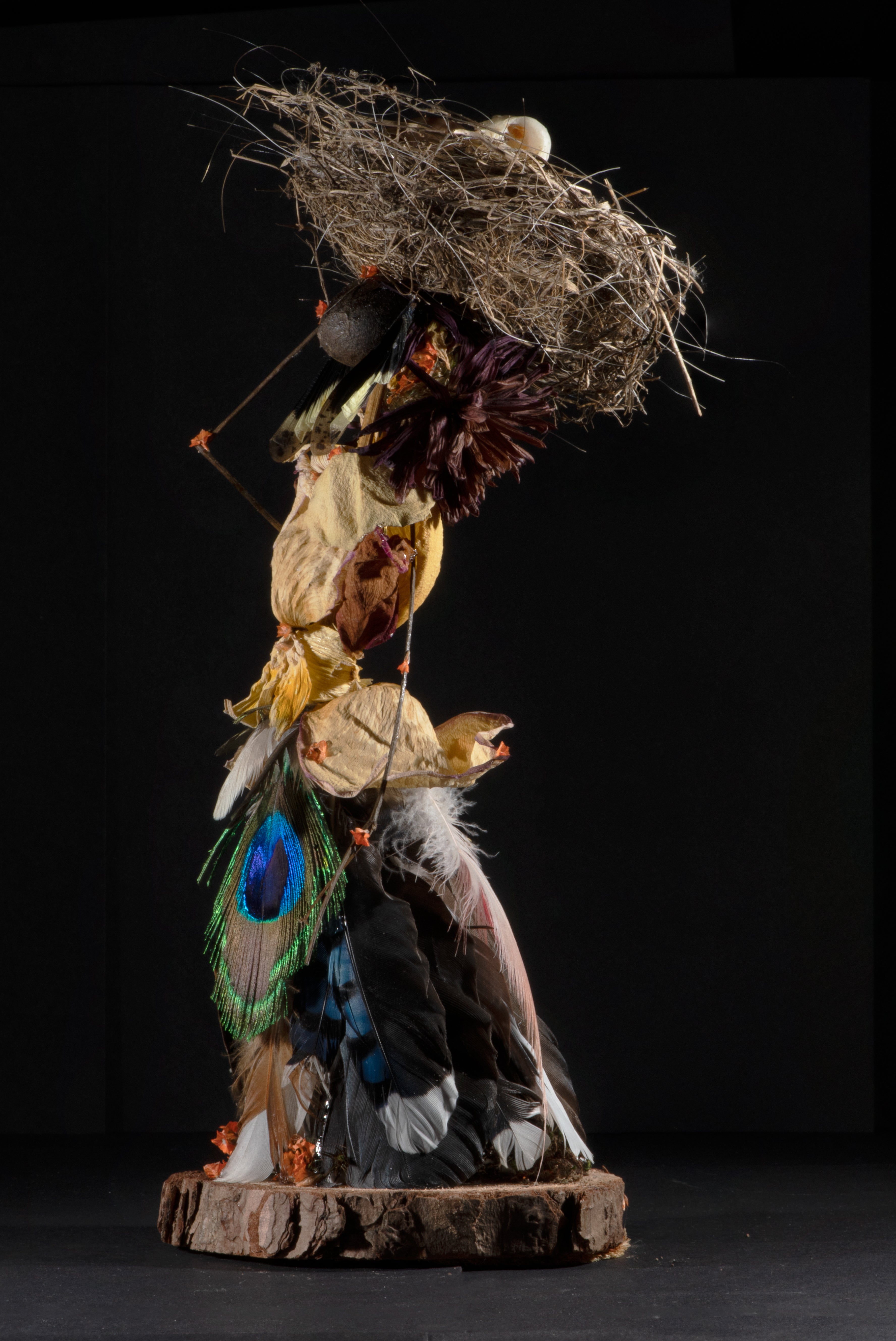 Delicate character figure sculpted from found object natural items, balanced on a wooden base. Featuring a regal, matronly character with a colorful skirt carrying a large nest full of goodies balanced on her head.