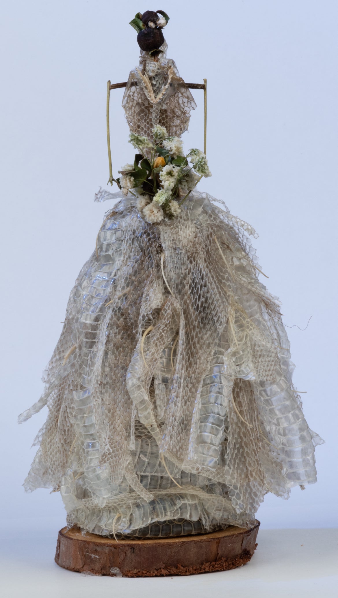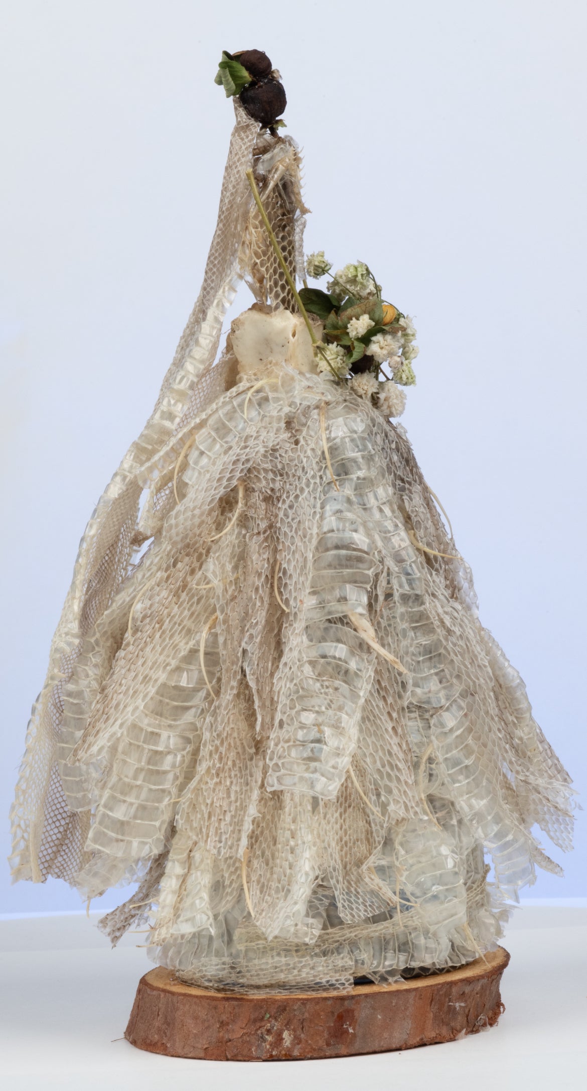 Delicate character figure sculpted from found object natural items, balanced on a wooden base. Featuring a bride and her bouquet, complete with trailing veil.
