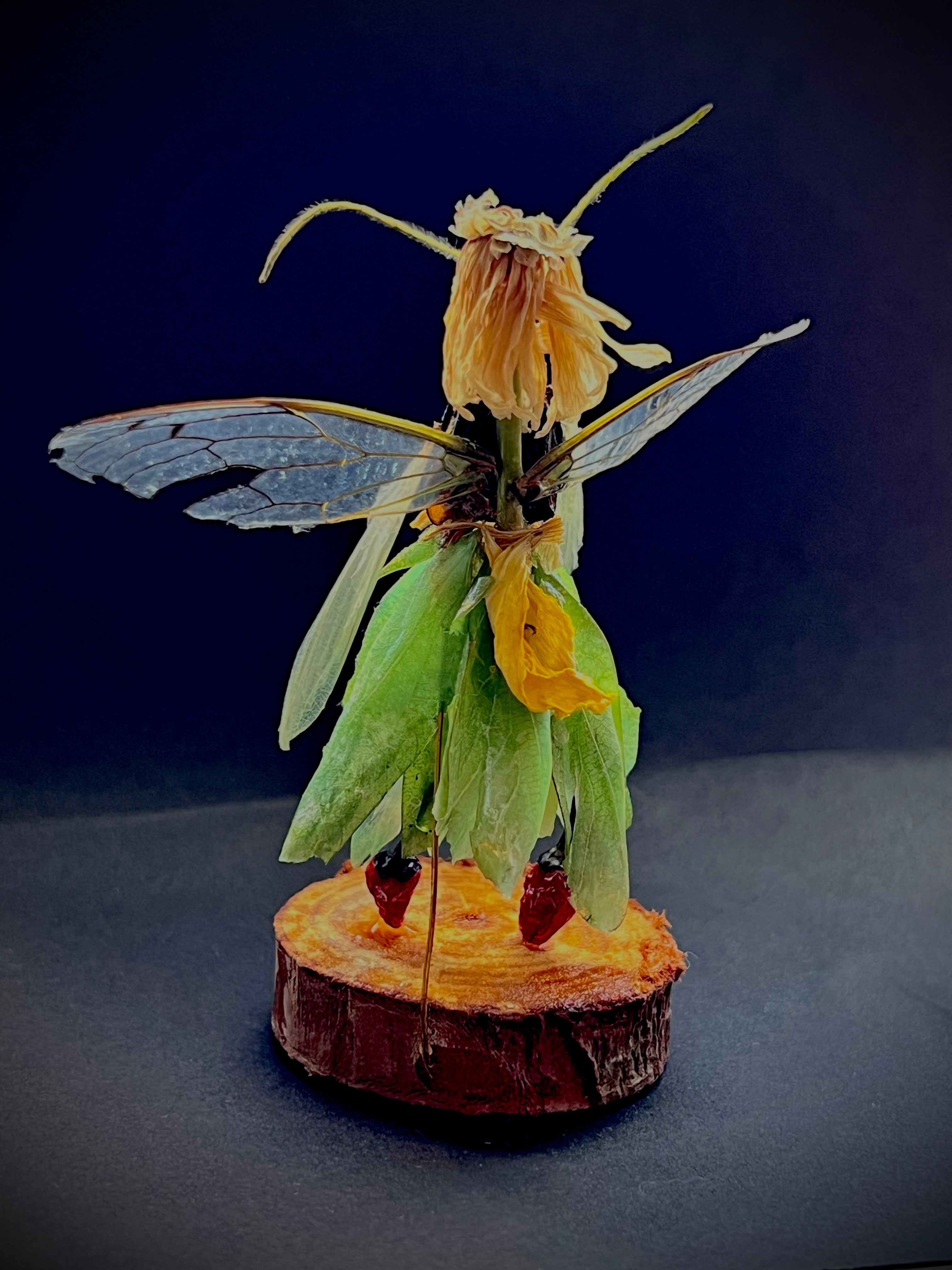 Materials : Tiny Chili Peppers, Katydid Elytra, Katydid Wings, June Beetle Body, Cicada Wings, Dried Daisy, Leaf Insect Antennae, Black Eyed Susan Petals