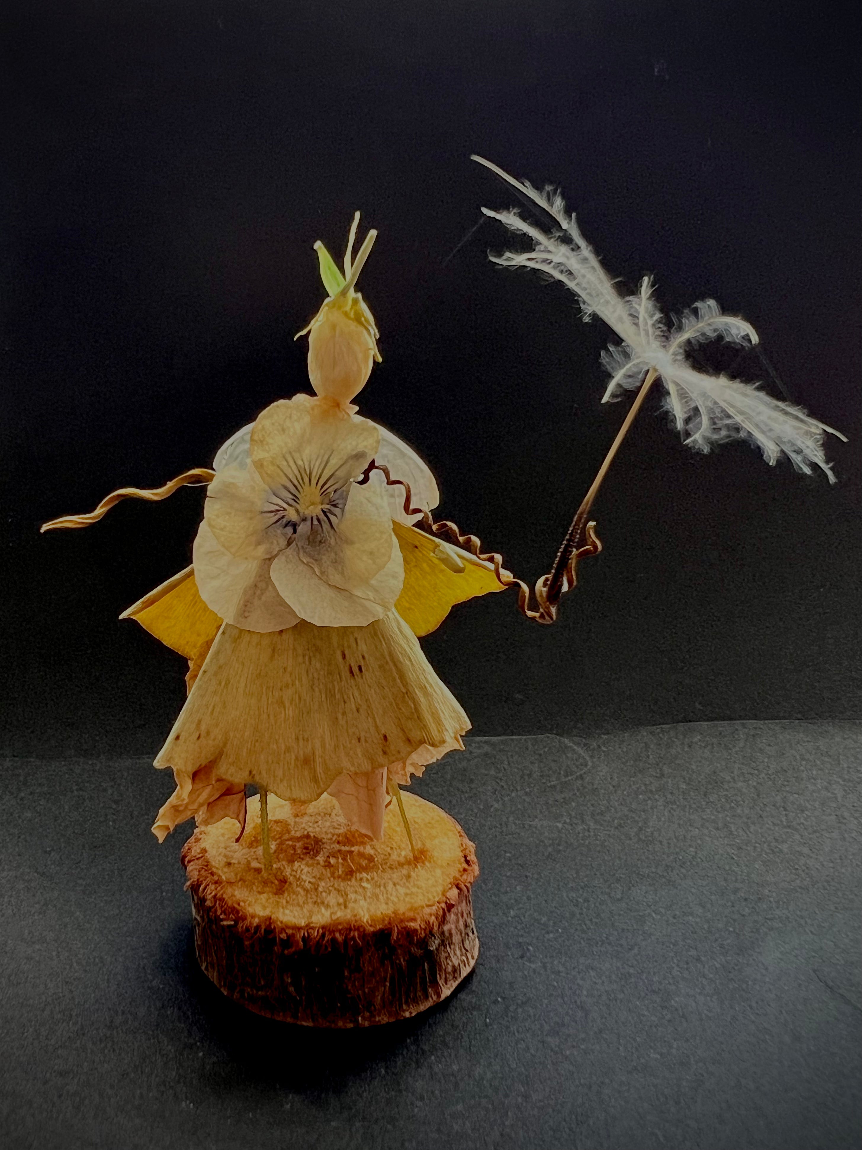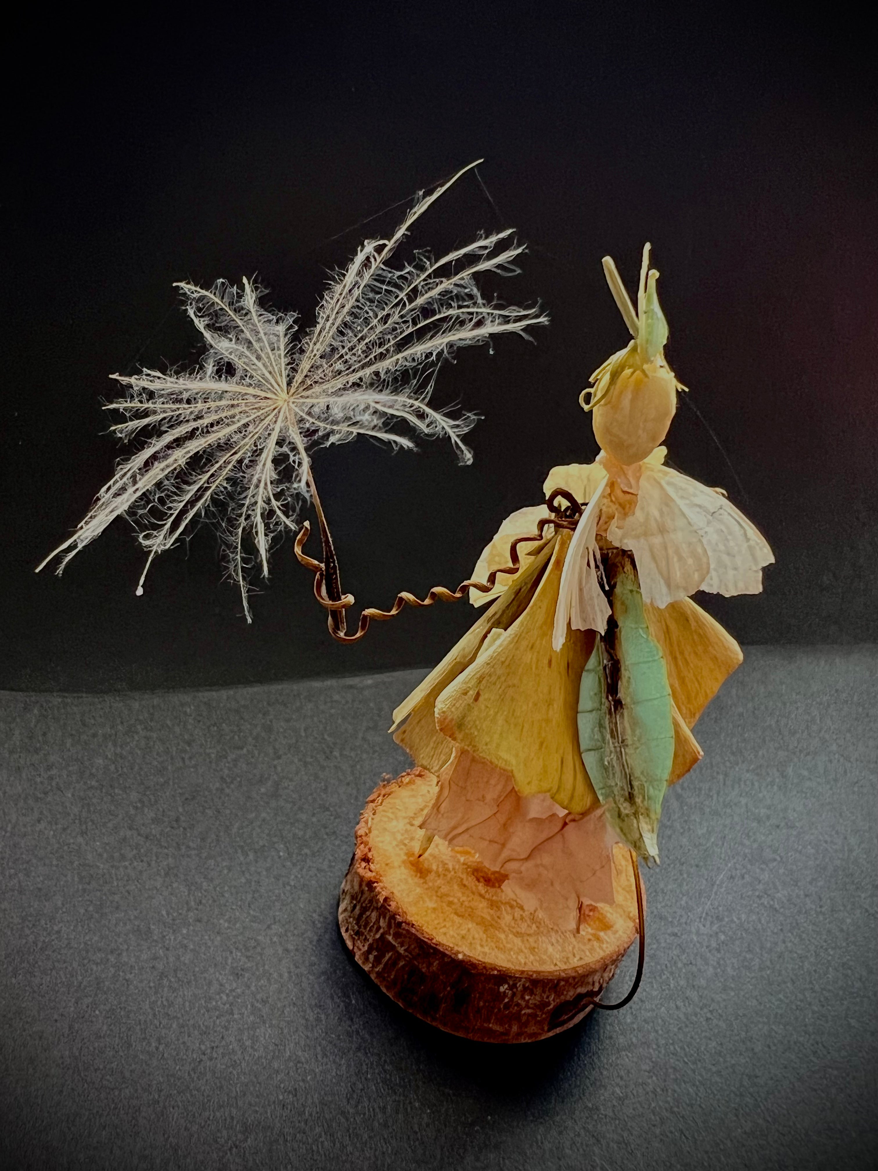 Delicate character figure sculpted from found object natural items, balanced on a wooden base. Featuring a tiny person holding a large "umbrella."