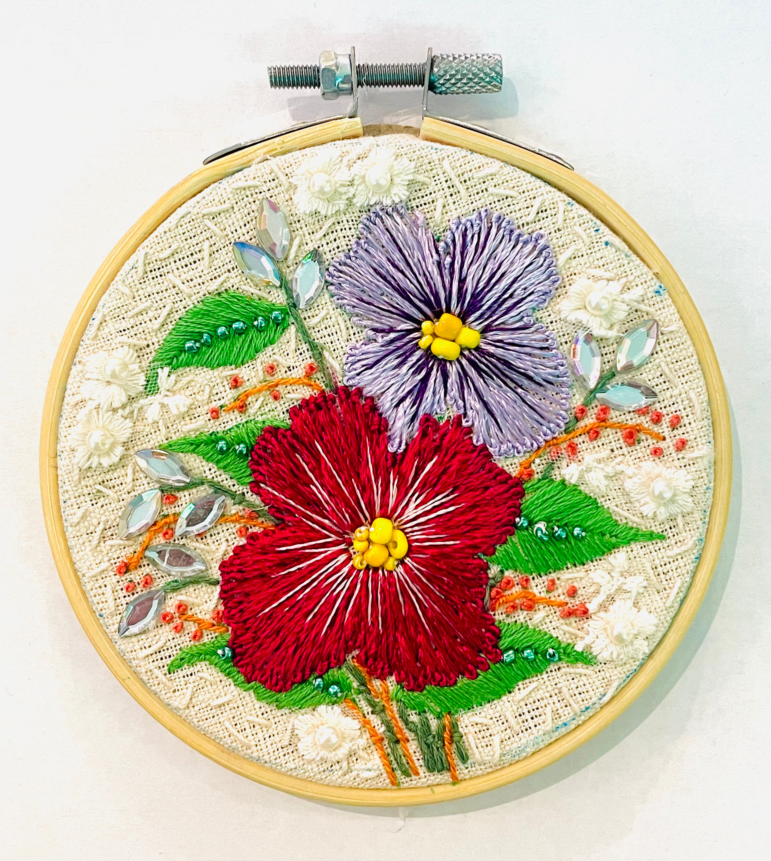 4" embroidery hoops with beadwork by local artist Gloria Ziegler.