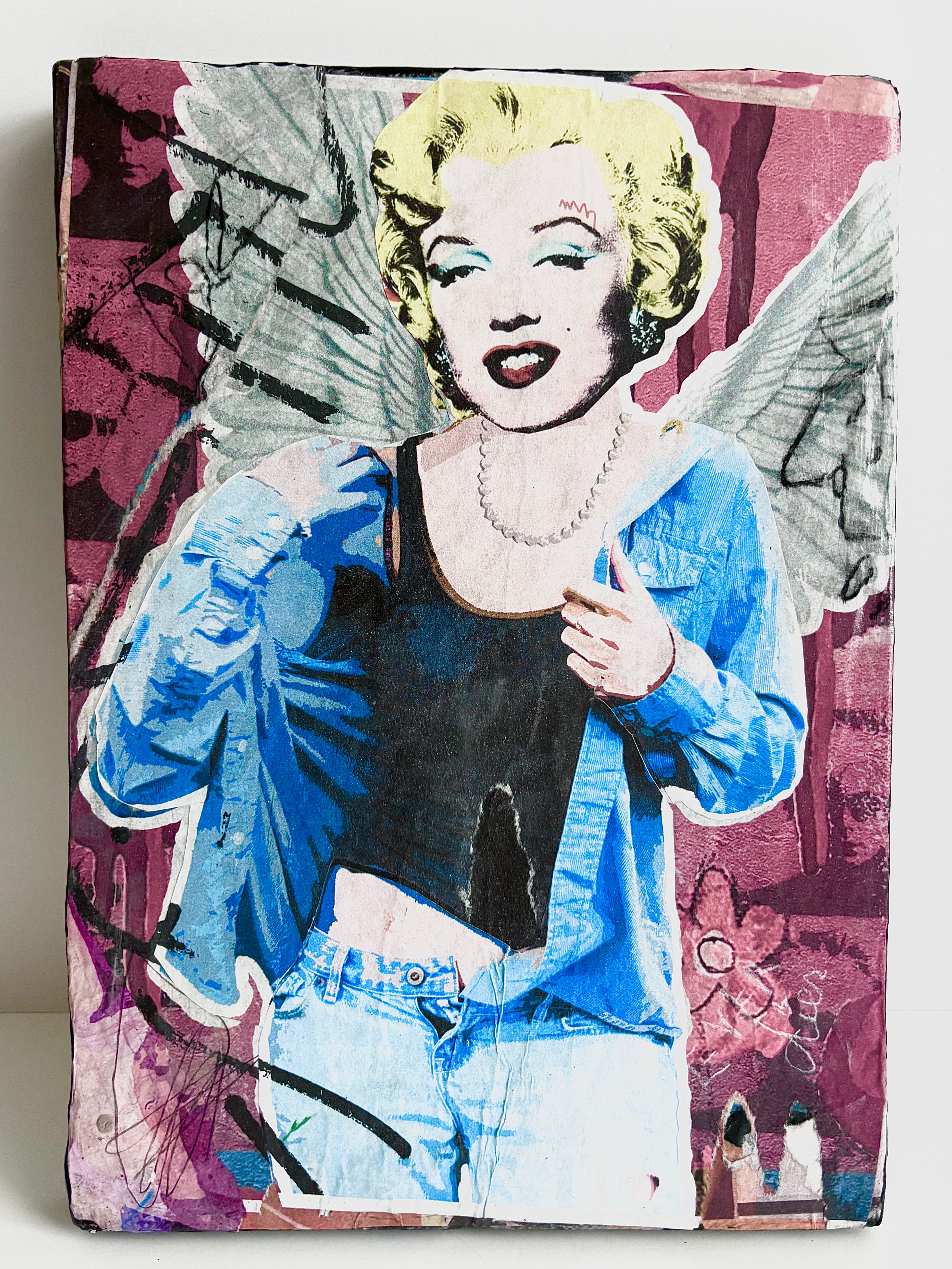 Named after the street art movement—each work of art includes found imagery, personal photography & drawings that are digitally manipulated, collaged and then wheat pasted on repurposed blocks of wood. Each piece is varnished, finished with black painted sides, signed & numbered on back.