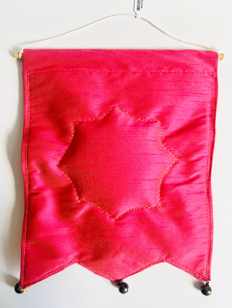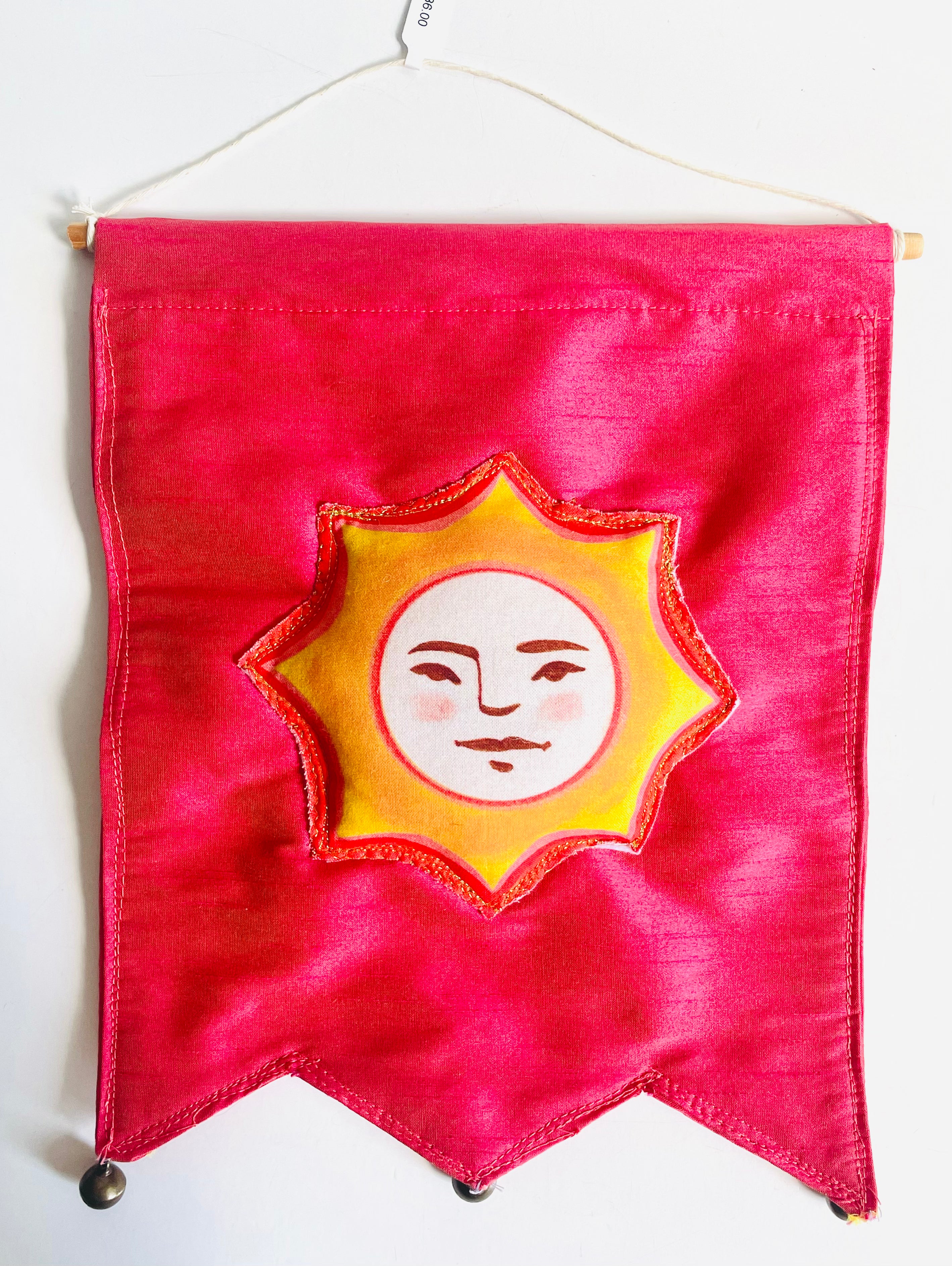 This hand-sewn banner features a sun illustration and bells. Created by Irene Mudd
