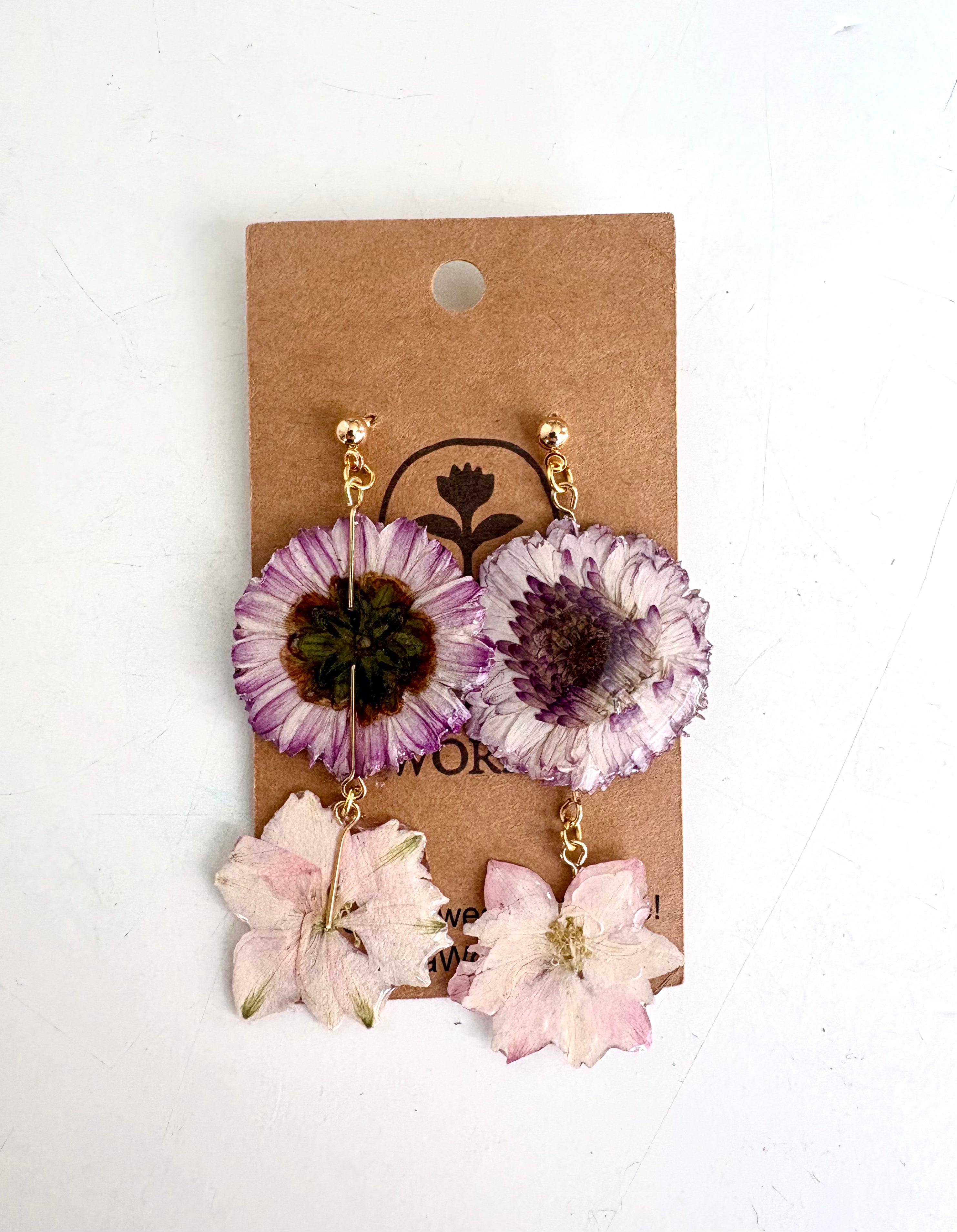 Organic pressed flowers cast in resin earrings by Louisville Artist, Jamilaworks. As these are natural and handmade, slight variations are to be expected in each pair.