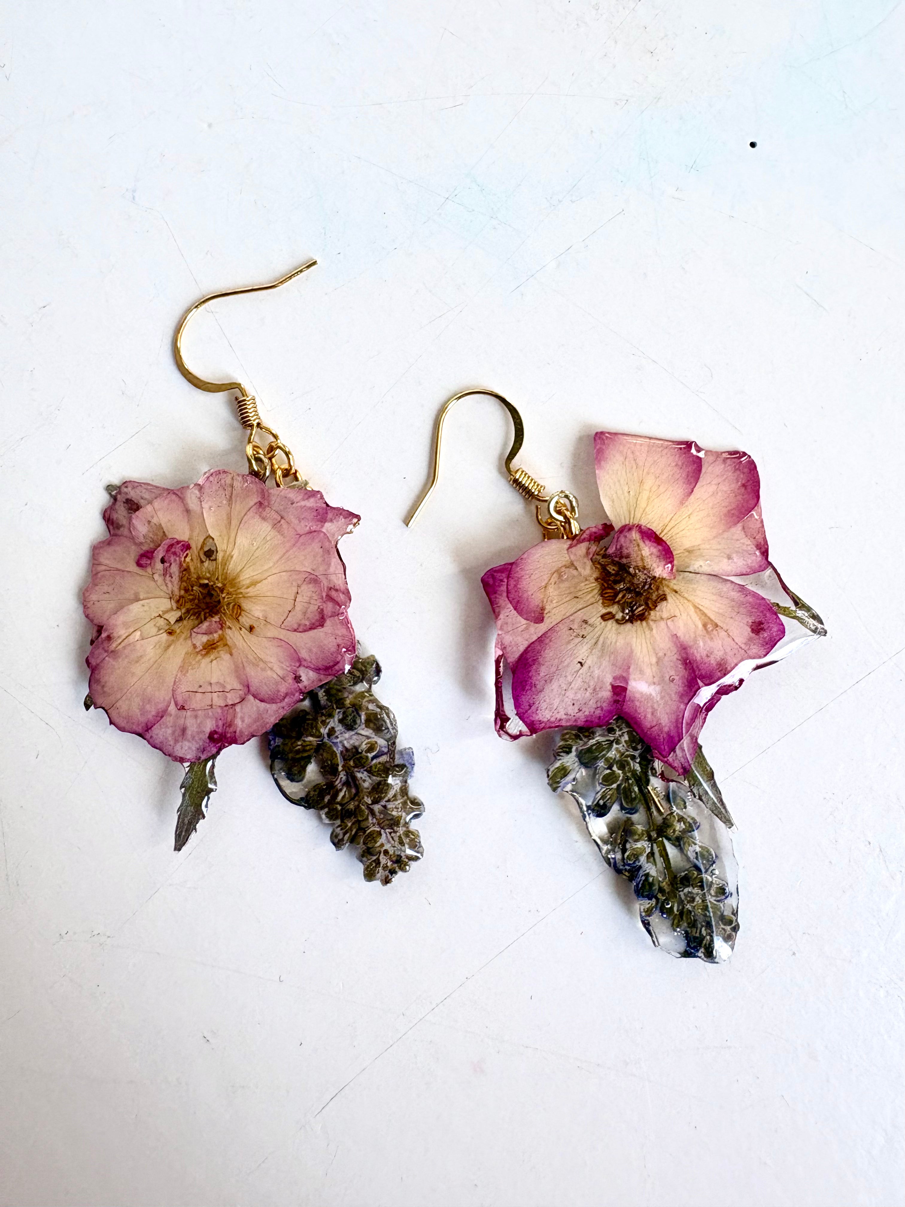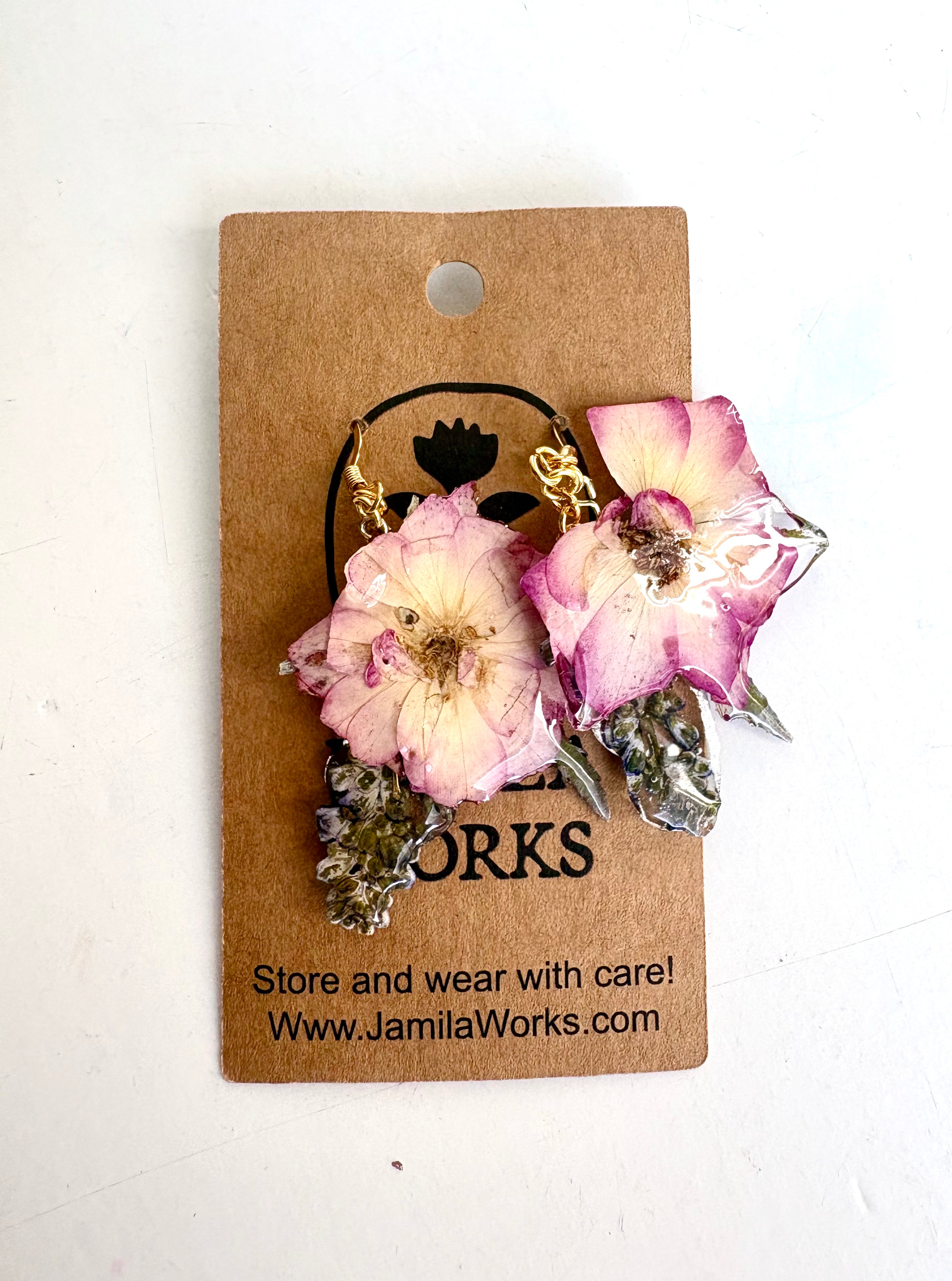 Organic pressed flowers cast in resin earrings by Louisville Artist, Jamilaworks. As these are natural and handmade, slight variations are to be expected in each pair.