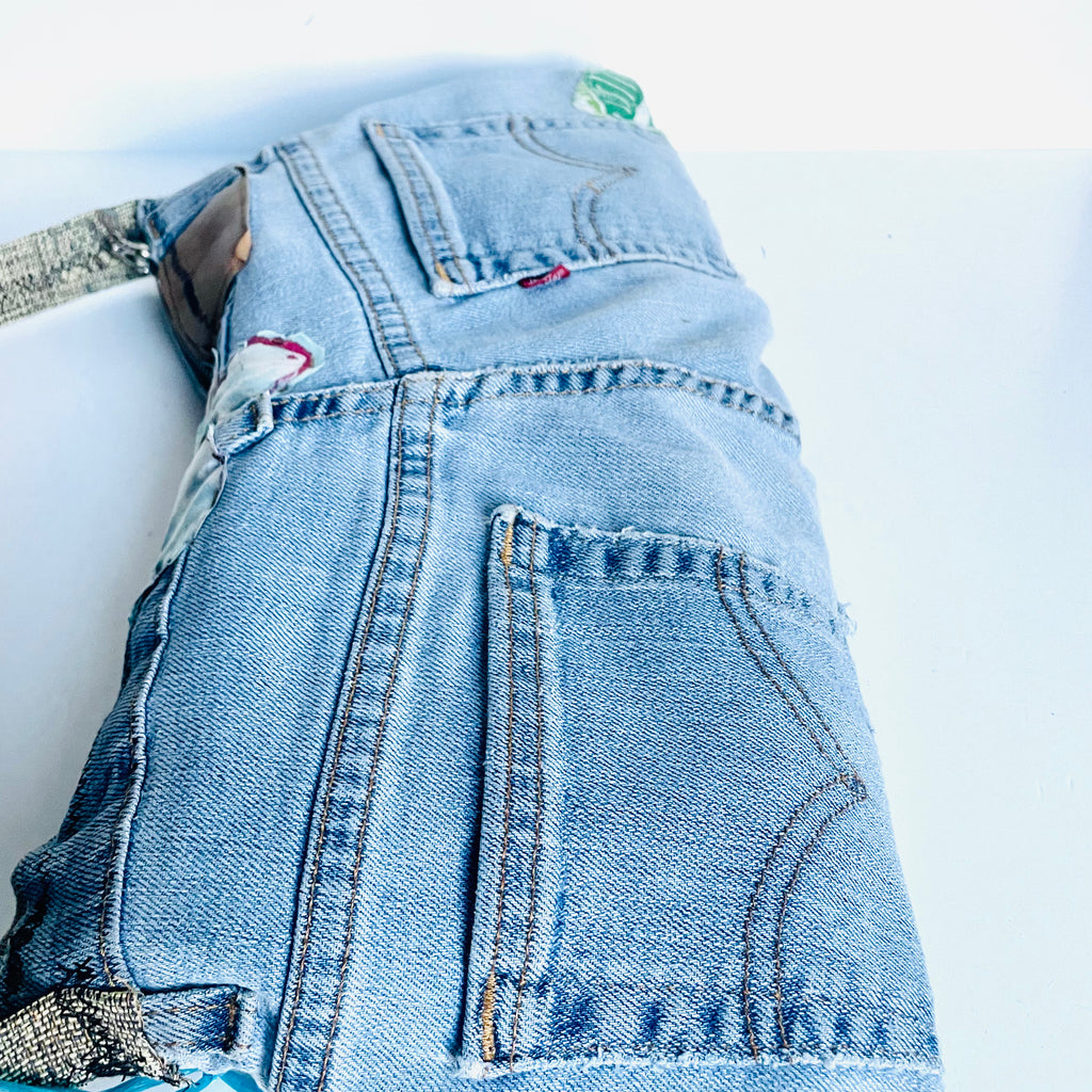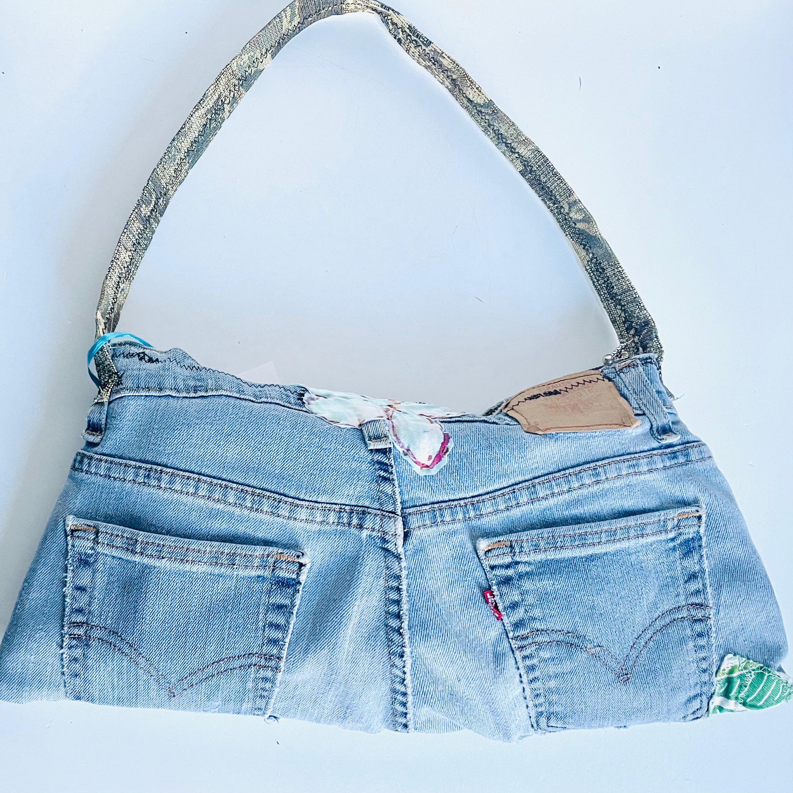 Hand sewn purse made out of recycled jeans, by local artist Janet Dake