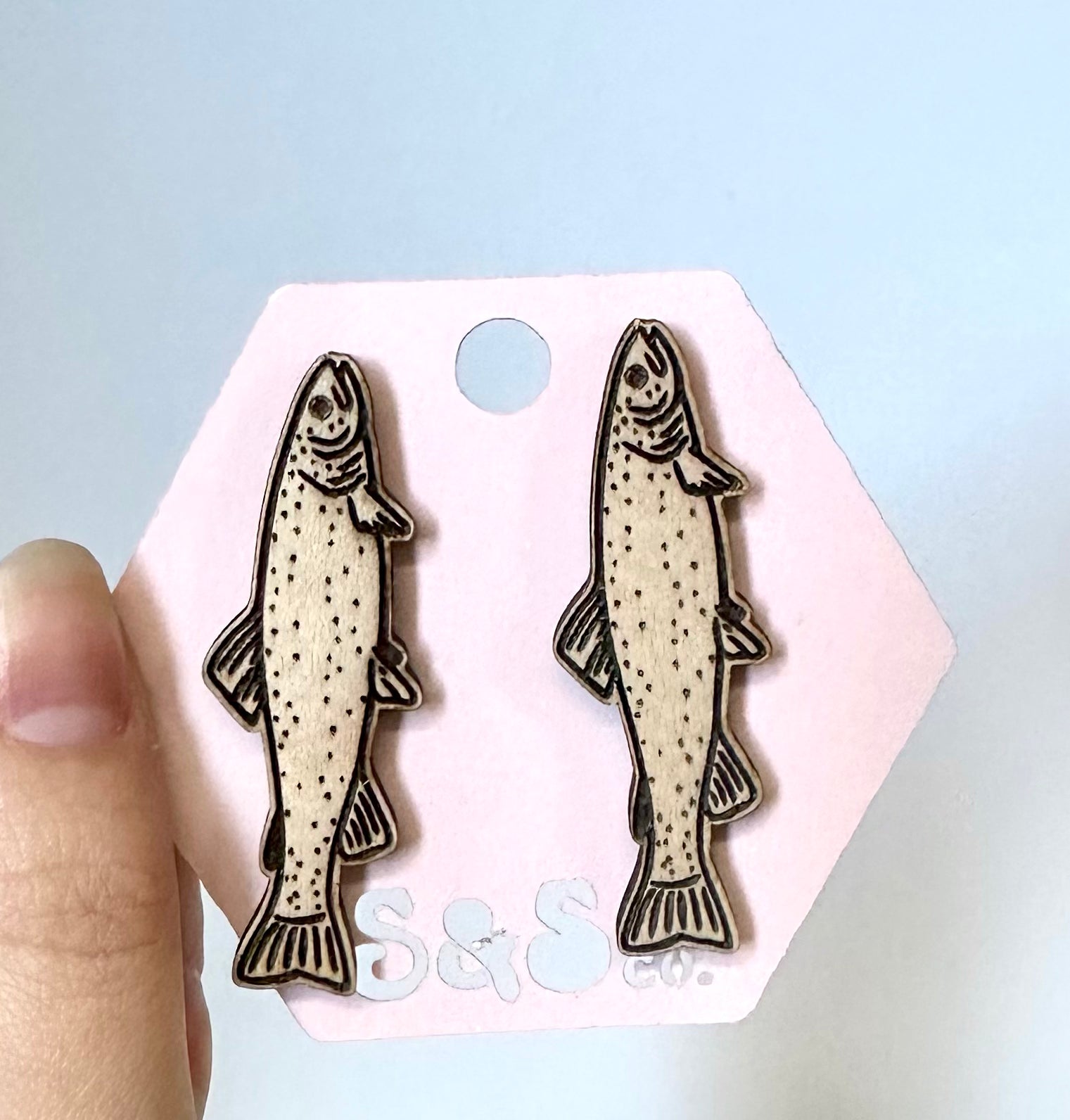 Laser-etched wood post earrings, by local artist Slate & Stone