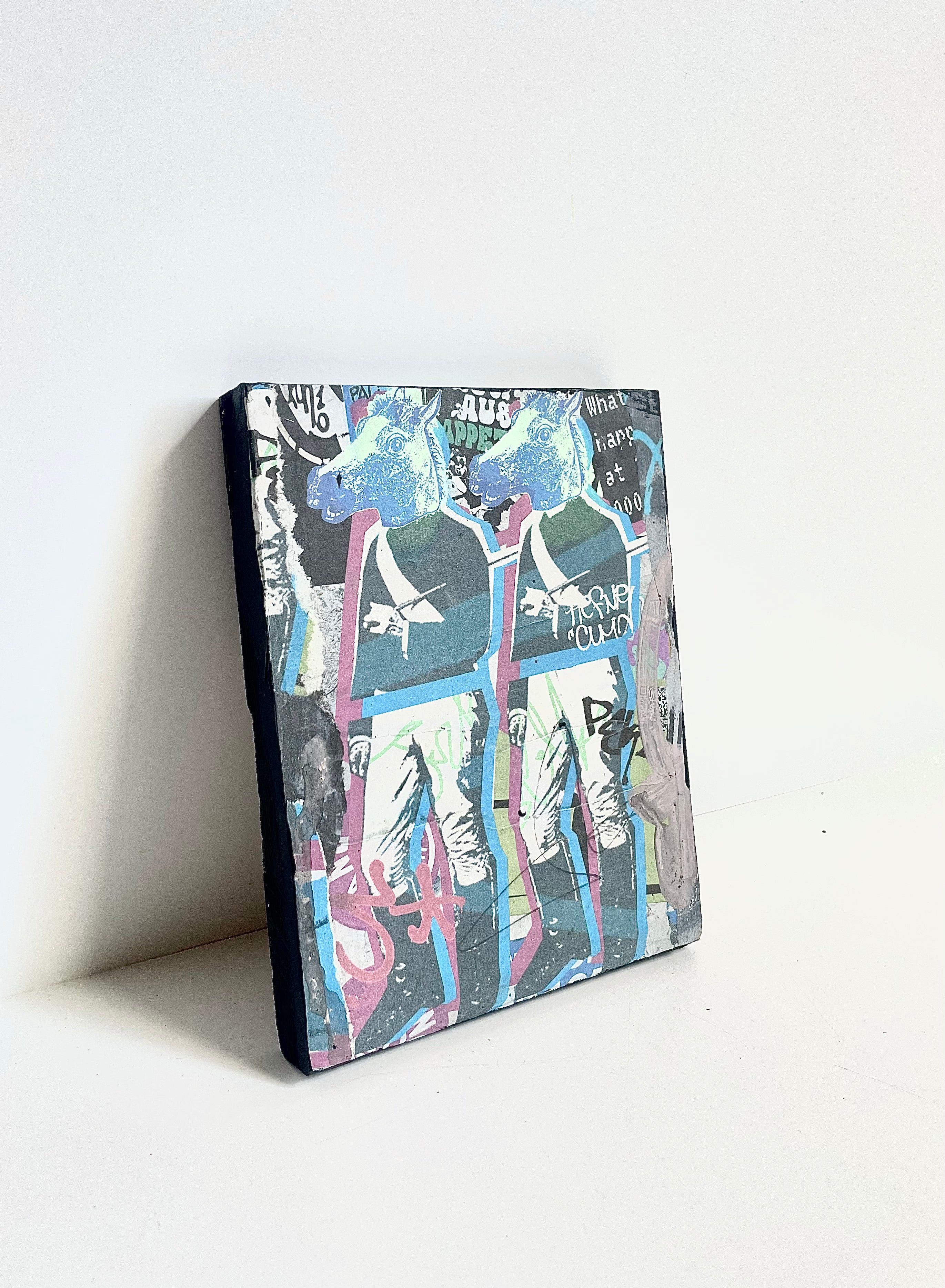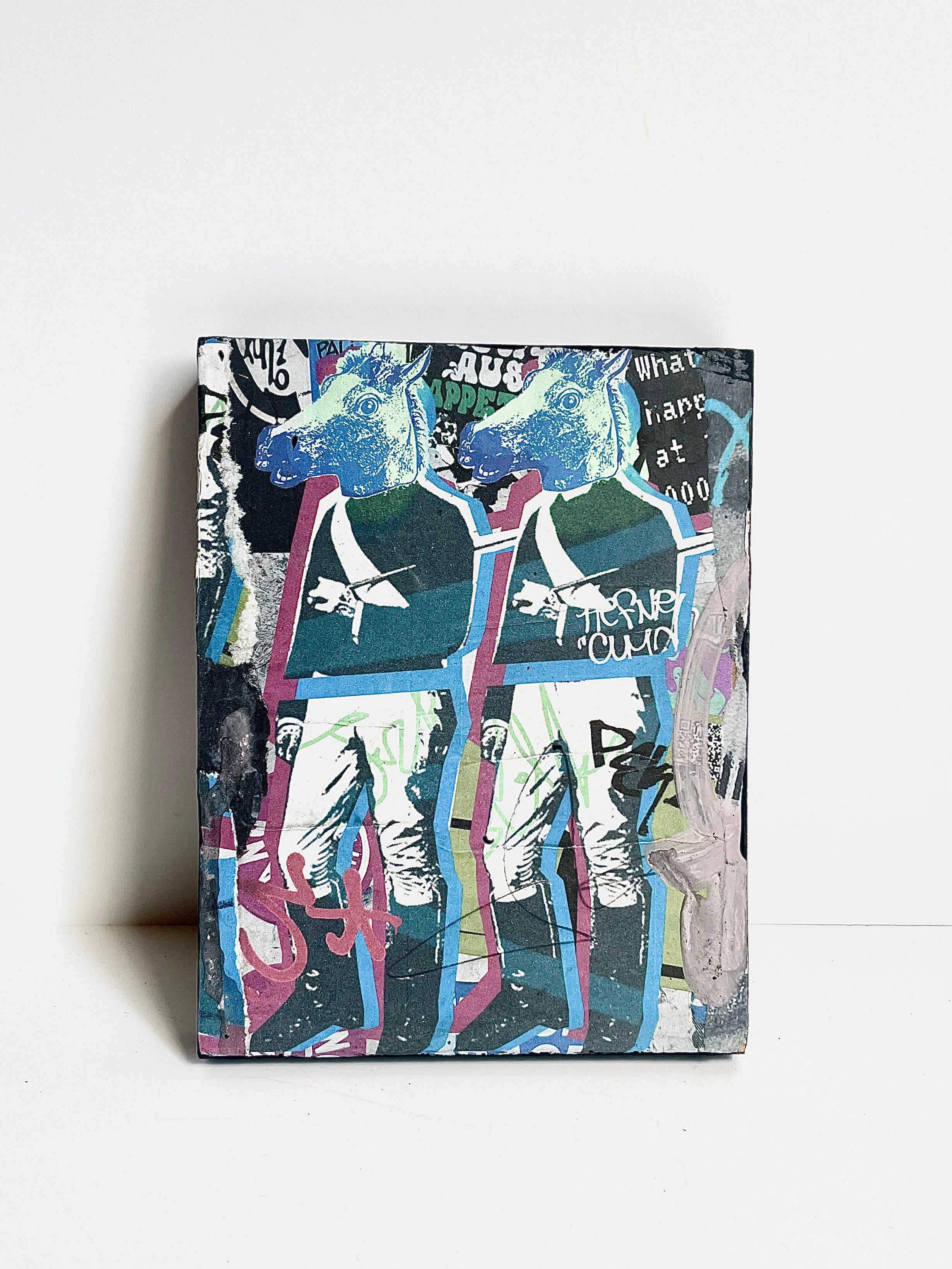 Named after the street art movement—each work of art includes found imagery, personal photography & drawings that are digitally manipulated, collaged and then wheat pasted on repurposed blocks of wood. Each piece is varnished, finished with black painted sides, signed & numbered on back.