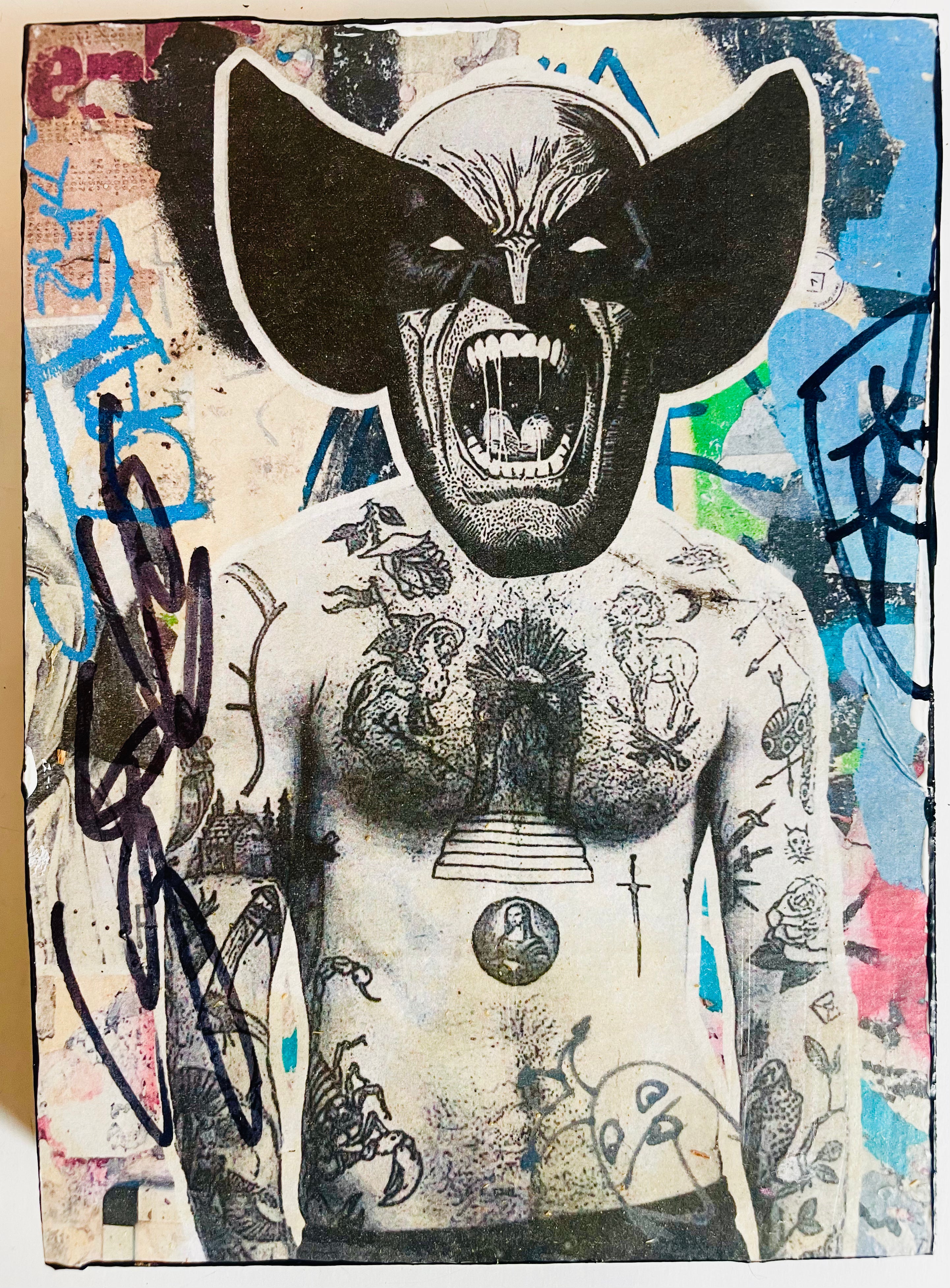 Named after the street art movement—each work of art includes found imagery, personal photography & drawings that are digitally manipulated, collaged and then wheat pasted on repurposed blocks of wood. Each piece is varnished, finished with black painted sides, signed & numbered on back.