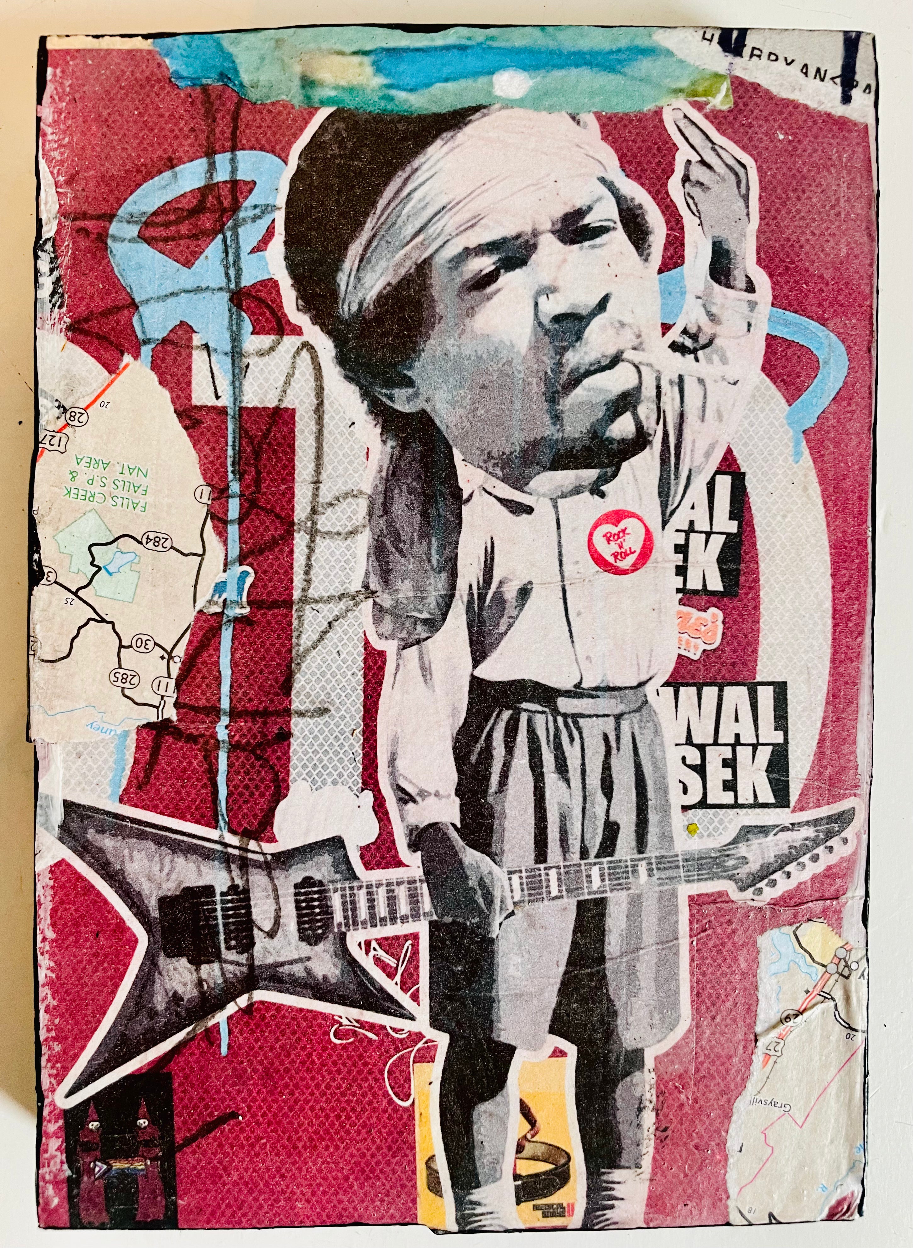 Named after the street art movement—each work of art includes found imagery, personal photography & drawings that are digitally manipulated, collaged and then wheat pasted on repurposed blocks of wood. Each piece is varnished, finished with black painted sides, signed & numbered on back.
