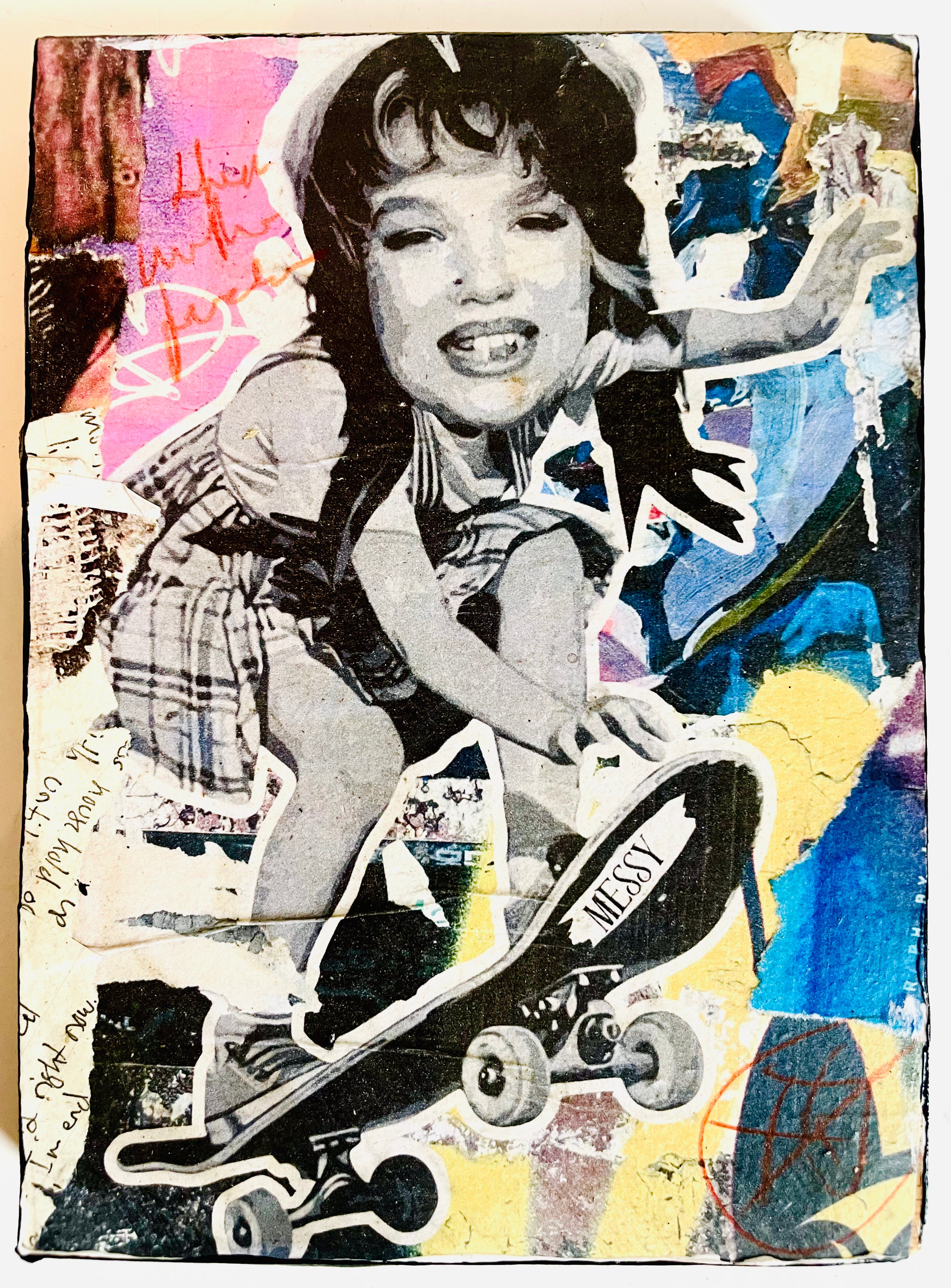 Named after the street art movement—each work of art includes found imagery, personal photography & drawings that are digitally manipulated, collaged and then wheat pasted on repurposed blocks of wood. Each piece is varnished, finished with black painted sides, signed & numbered on back.