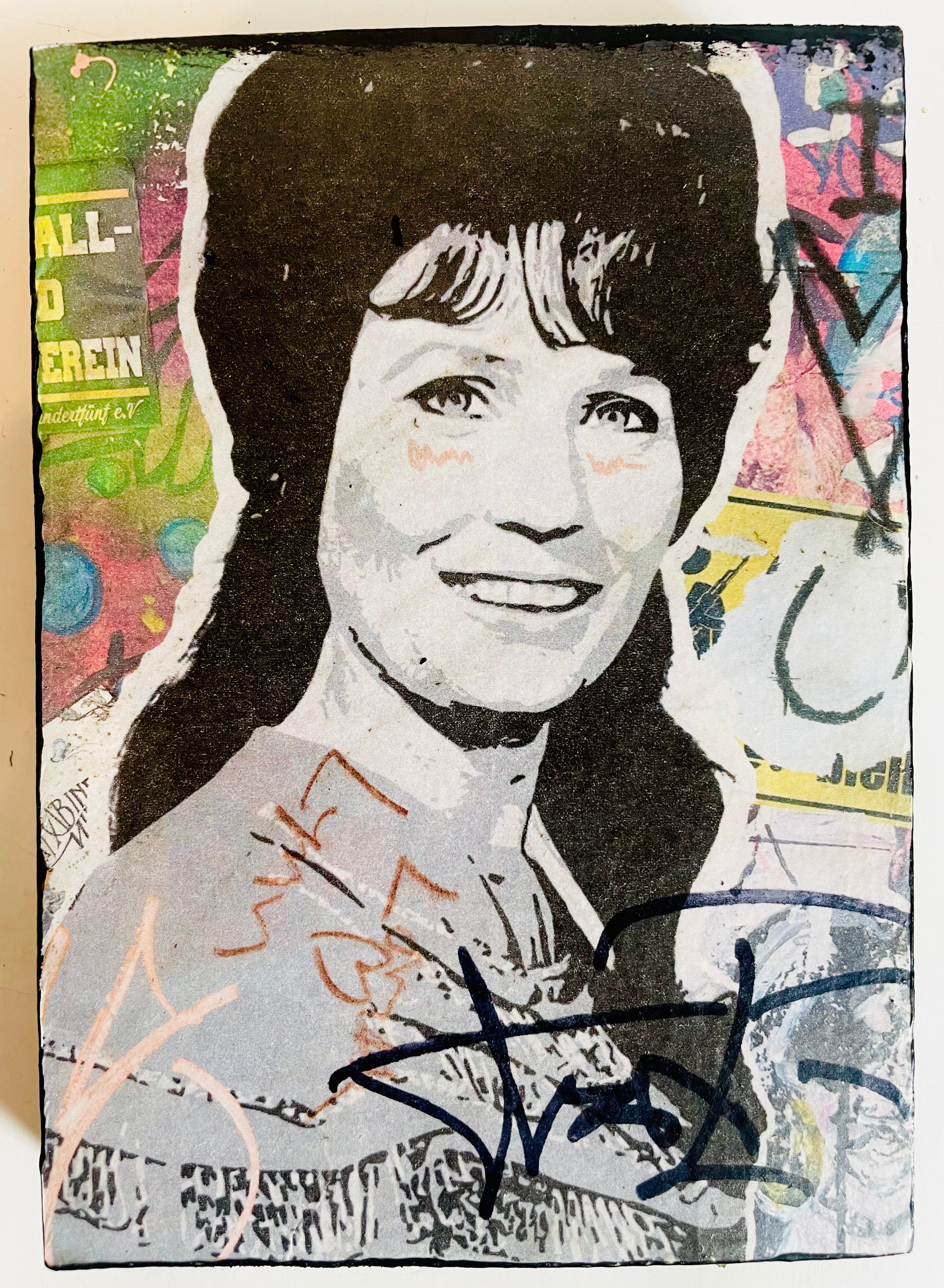 Named after the street art movement—each work of art includes found imagery, personal photography & drawings that are digitally manipulated, collaged and then wheat pasted on repurposed blocks of wood. Each piece is varnished, finished with black painted sides, signed & numbered on back.