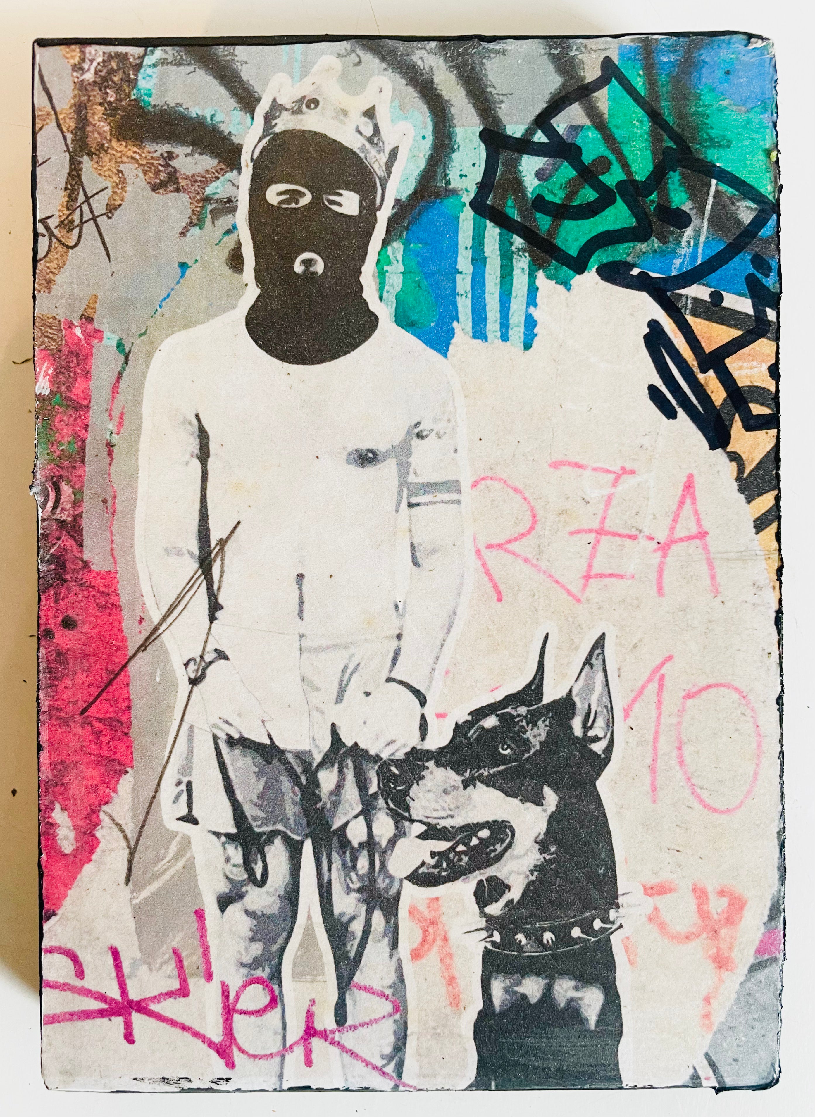 Named after the street art movement—each work of art includes found imagery, personal photography & drawings that are digitally manipulated, collaged and then wheat pasted on repurposed blocks of wood. Each piece is varnished, finished with black painted sides, signed & numbered on back.
