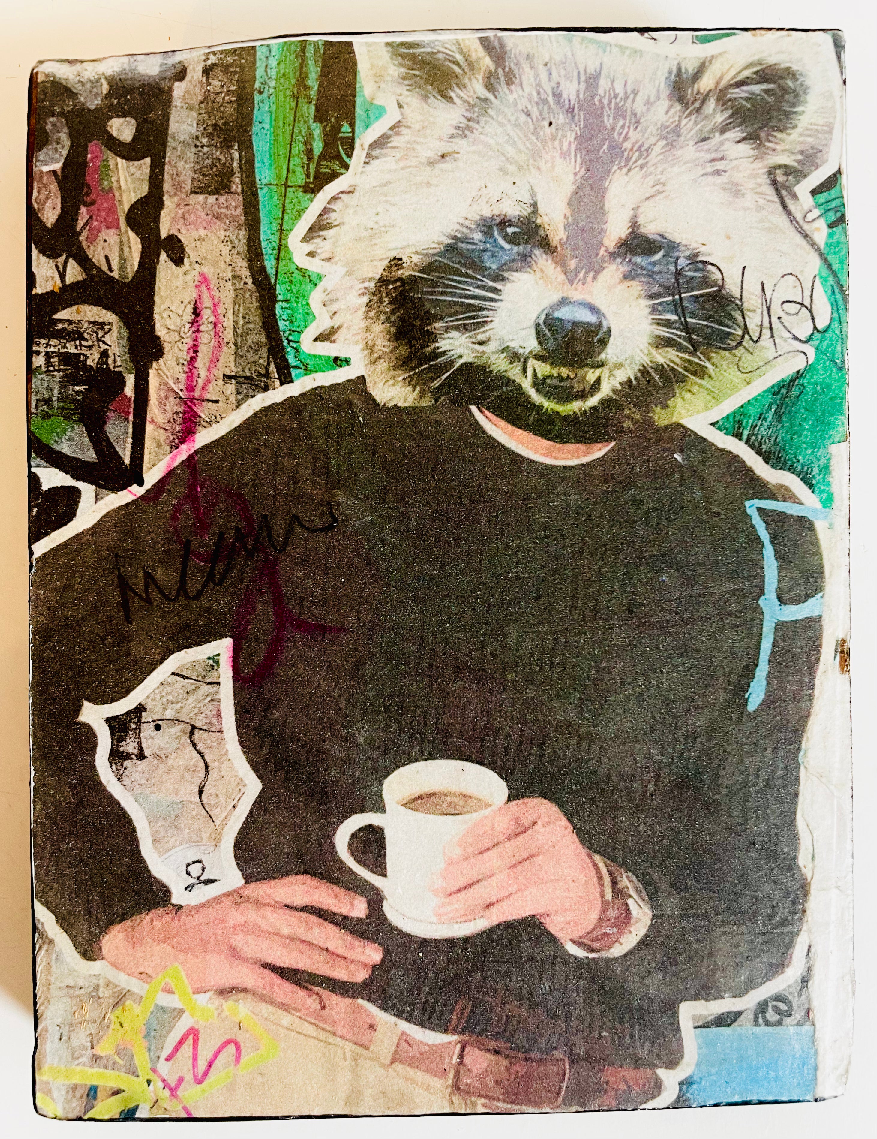 Named after the street art movement—each work of art includes found imagery, personal photography & drawings that are digitally manipulated, collaged and then wheat pasted on repurposed blocks of wood. Each piece is varnished, finished with black painted sides, signed & numbered on back.