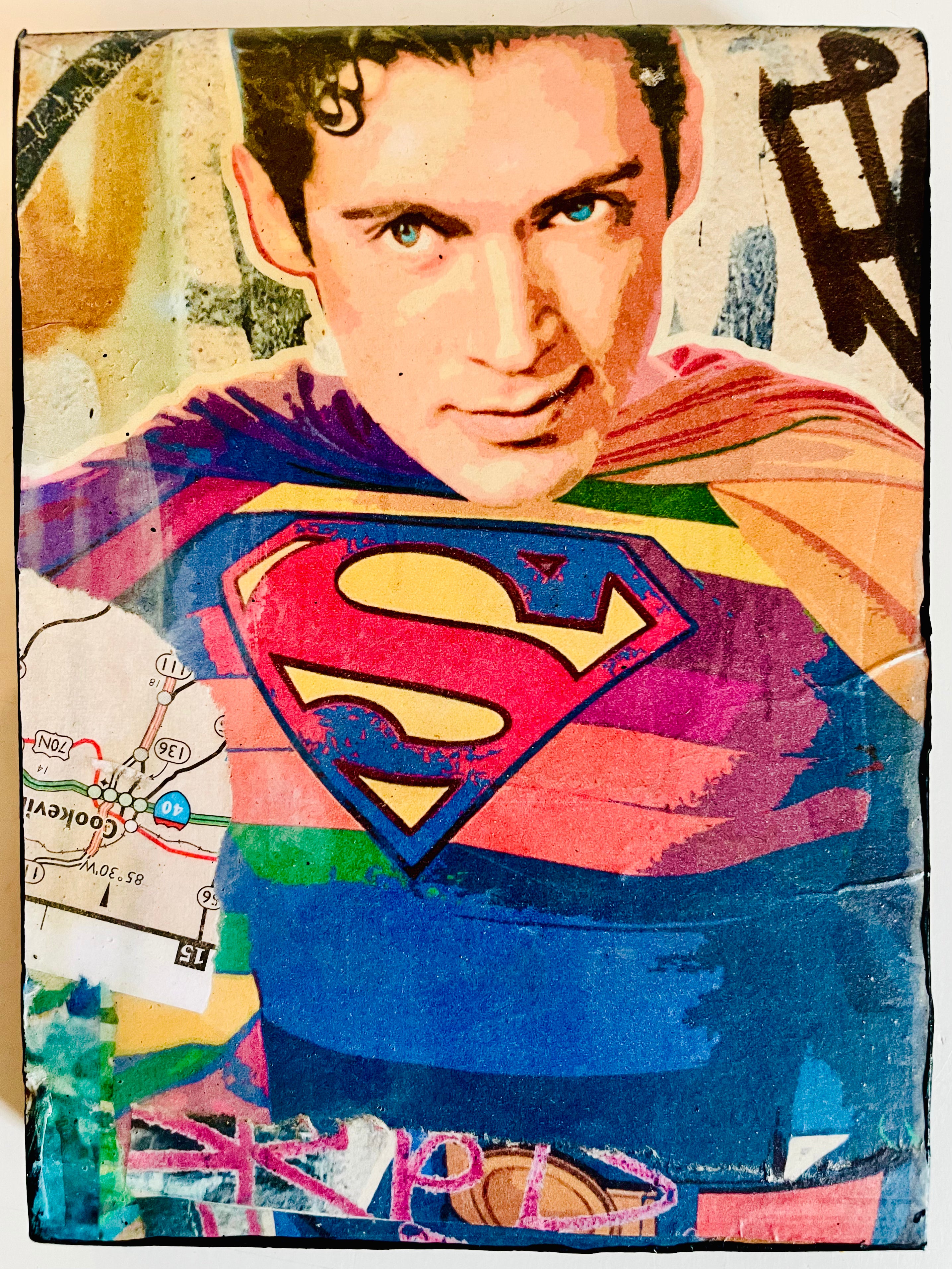 Named after the street art movement—each work of art includes found imagery, personal photography & drawings that are digitally manipulated, collaged and then wheat pasted on repurposed blocks of wood. Each piece is varnished, finished with black painted sides, signed & numbered on back.
