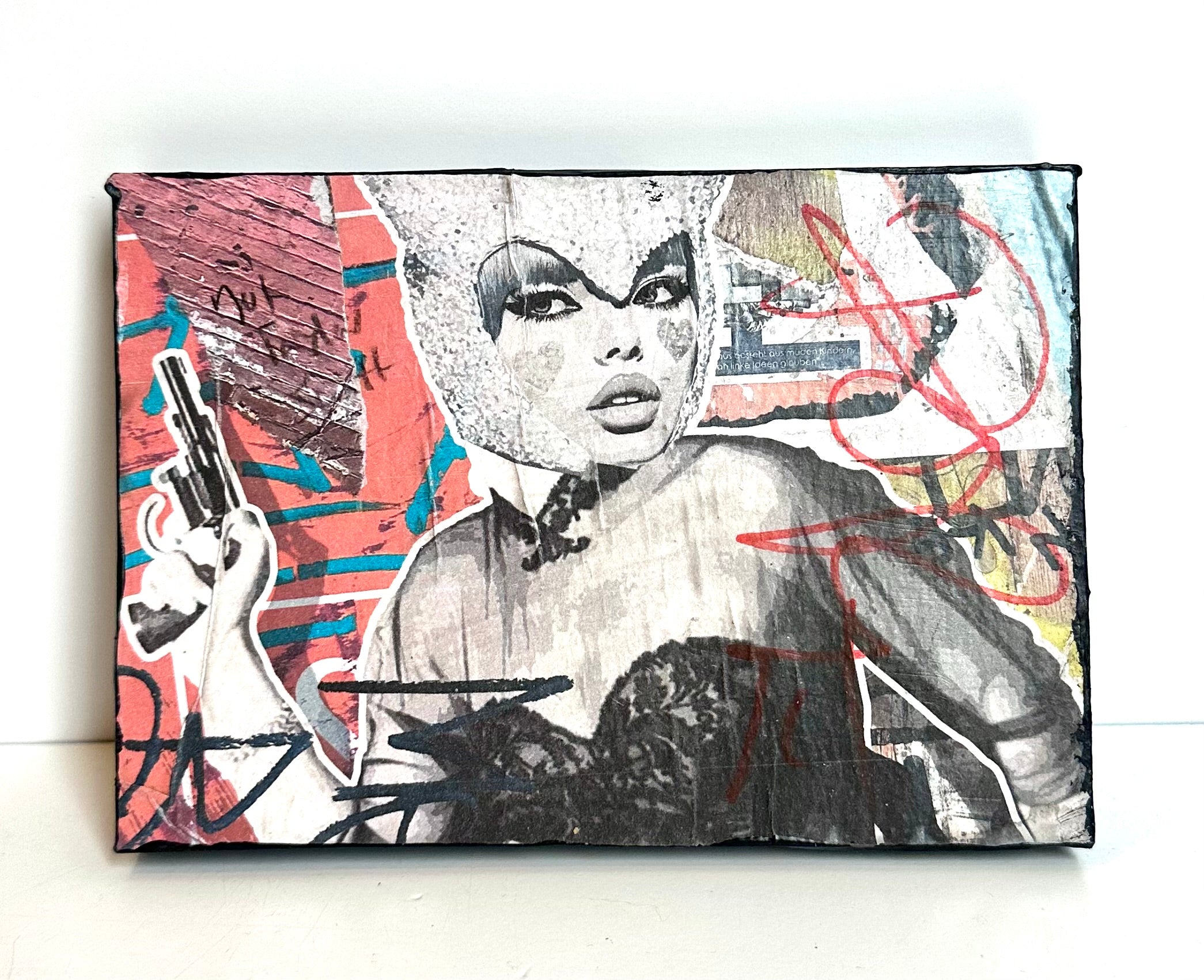 Named after the street art movement—each work of art includes found imagery, personal photography & drawings that are digitally manipulated, collaged and then wheat pasted on repurposed blocks of wood. Each piece is varnished, finished with black painted sides, signed & numbered on back.