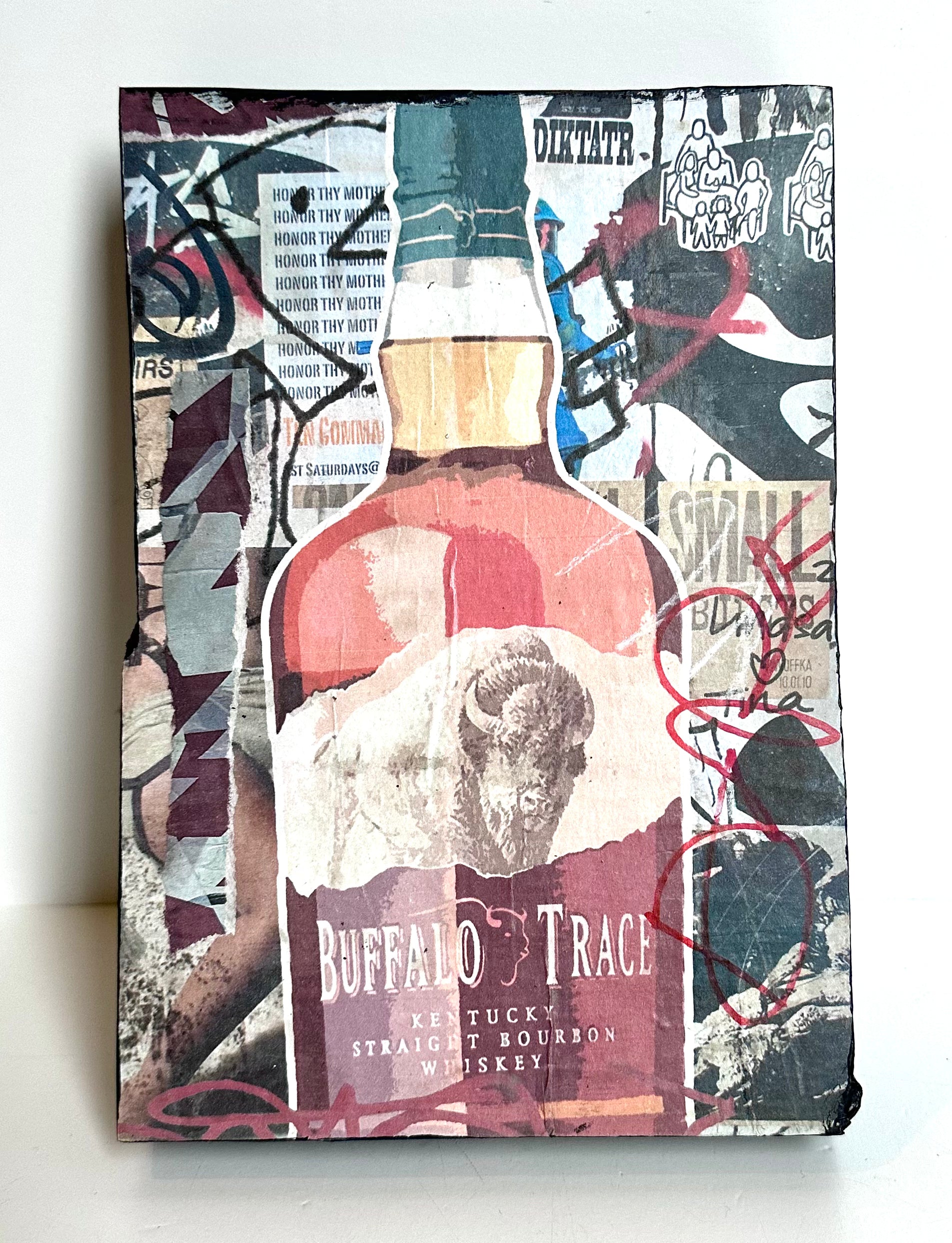 Named after the street art movement—each work of art includes found imagery, personal photography & drawings that are digitally manipulated, collaged and then wheat pasted on repurposed blocks of wood. Each piece is varnished, finished with black painted sides, signed & numbered on back.