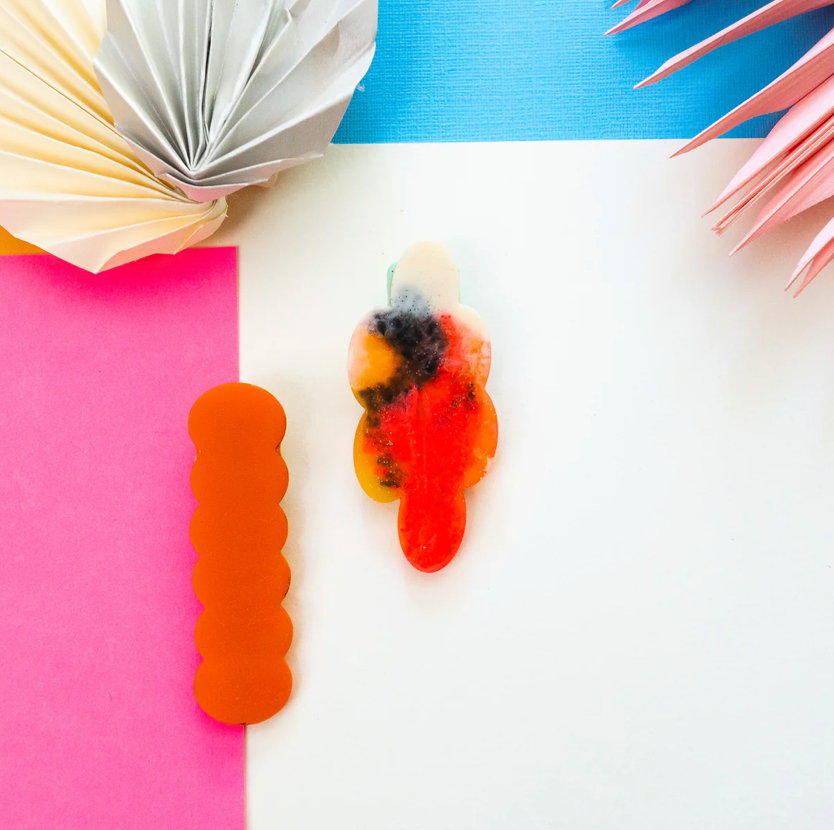 Hand illustrated and painted design is made out of laser cut recycled acrylic, hand pored plant based resin and hypoallergenic, surgical grade, gold, stainless steel findings. Every hair clip is one of a kind and will have minor differences from the picture due to their handmade nature.