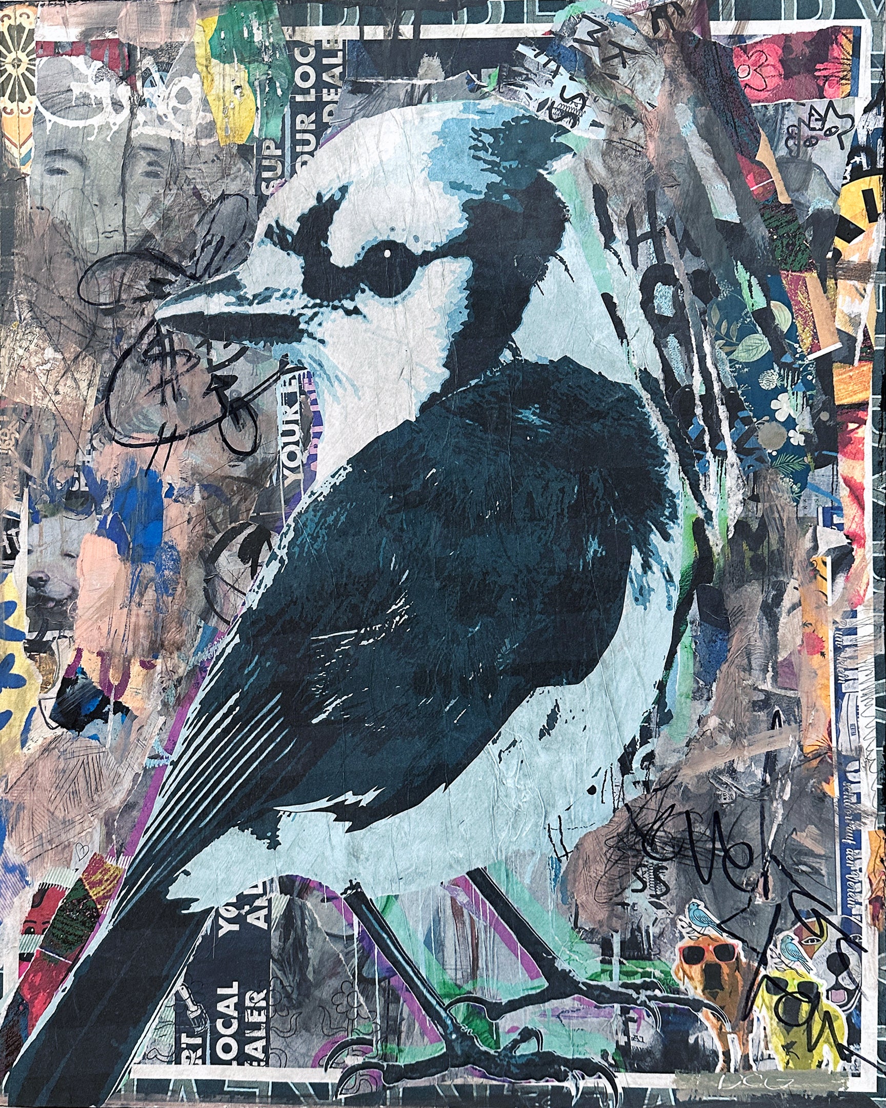 "This mixed media collage is part of my ongoing series Guerrilla XL, created in celebration of the 15-year anniversary of the gallery that has supported and represented me—and so many other local voices—over the years. At its core is the iconic bluebird, a tribute to the gallery’s logo and the spirit of community, creativity, and resilience it represents.