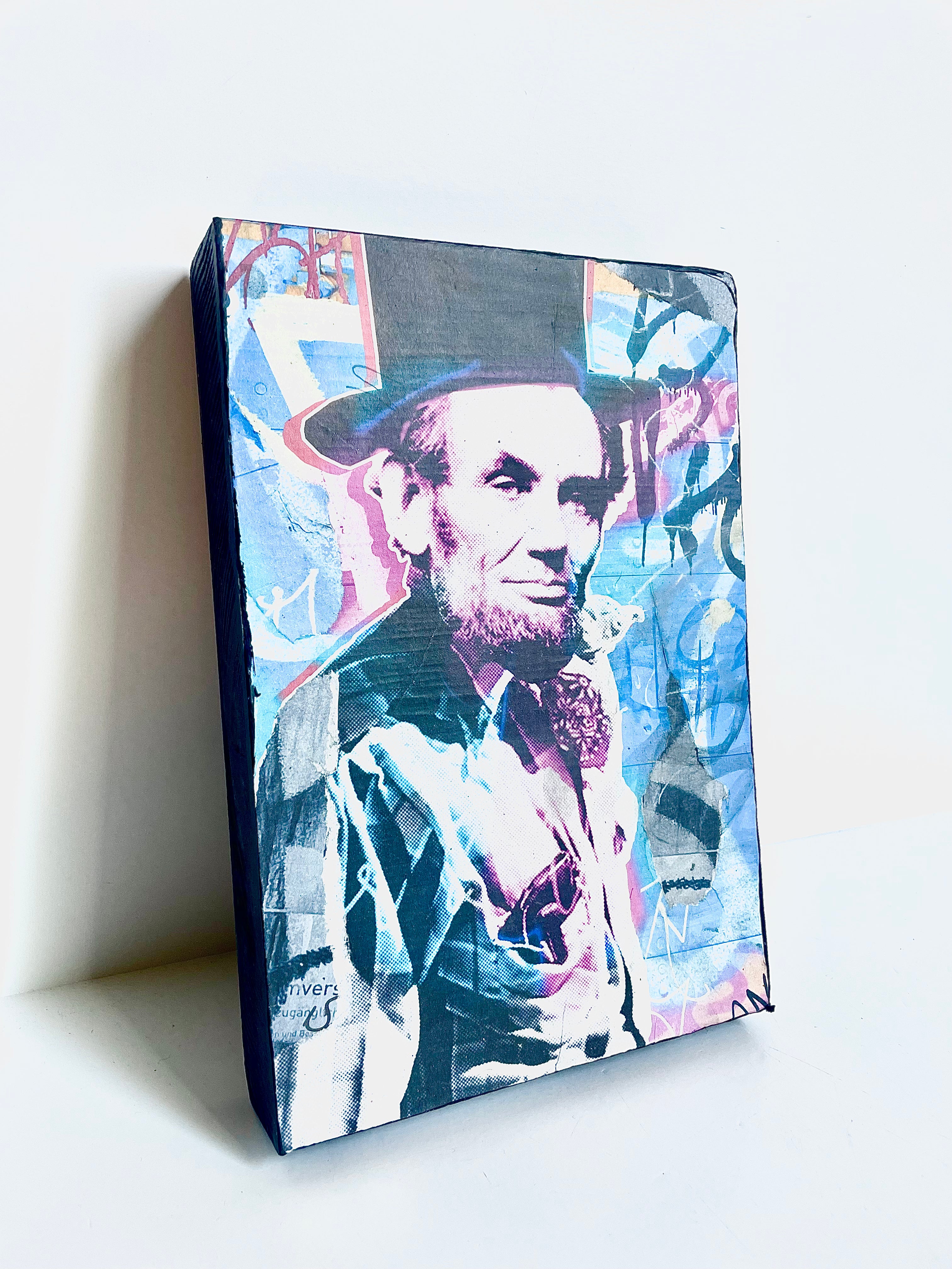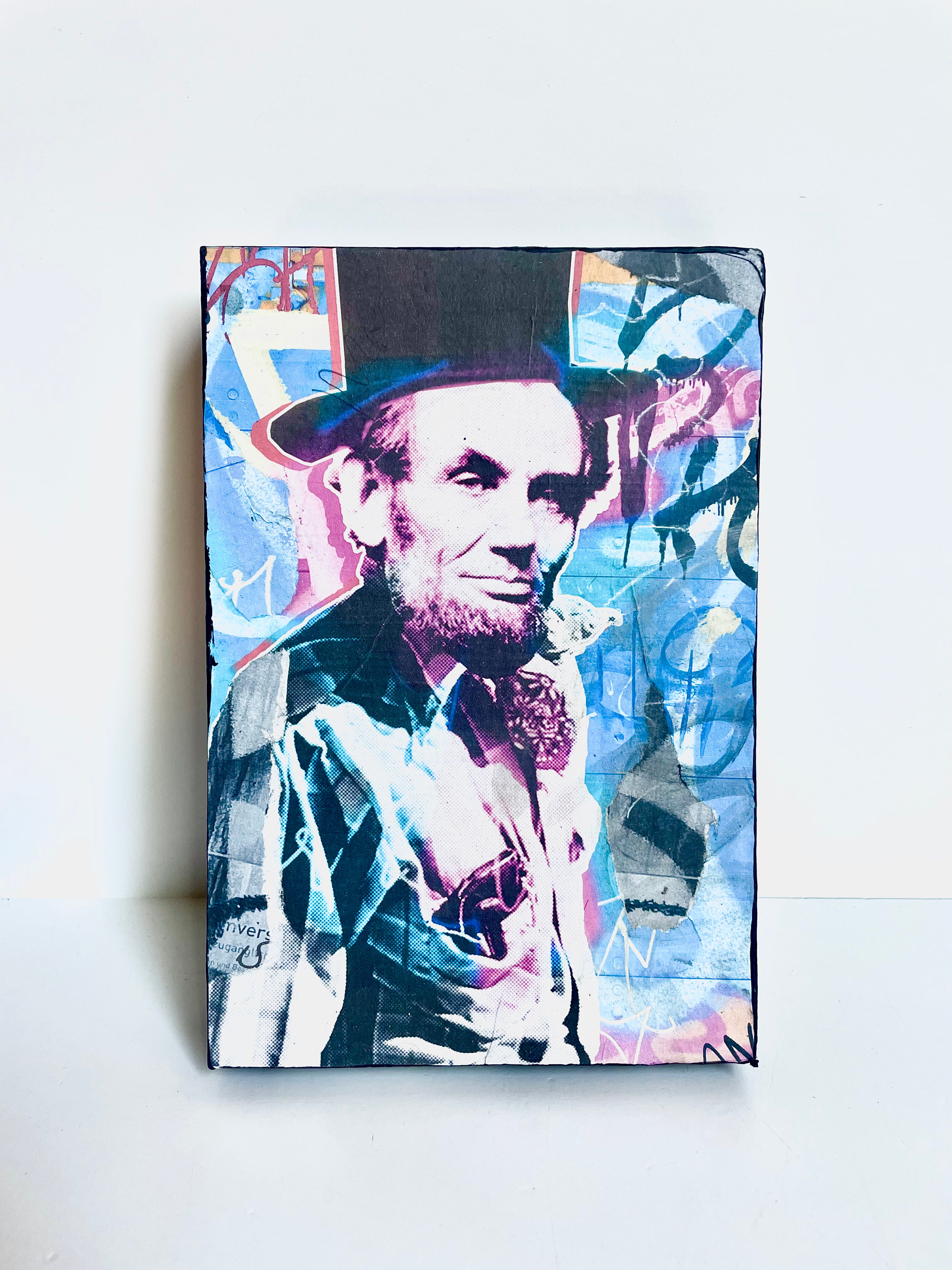 Named after the street art movement—each work of art includes found imagery, personal photography & drawings that are digitally manipulated, collaged and then wheat pasted on repurposed blocks of wood. Each piece is varnished, finished with black painted sides, signed & numbered on back.