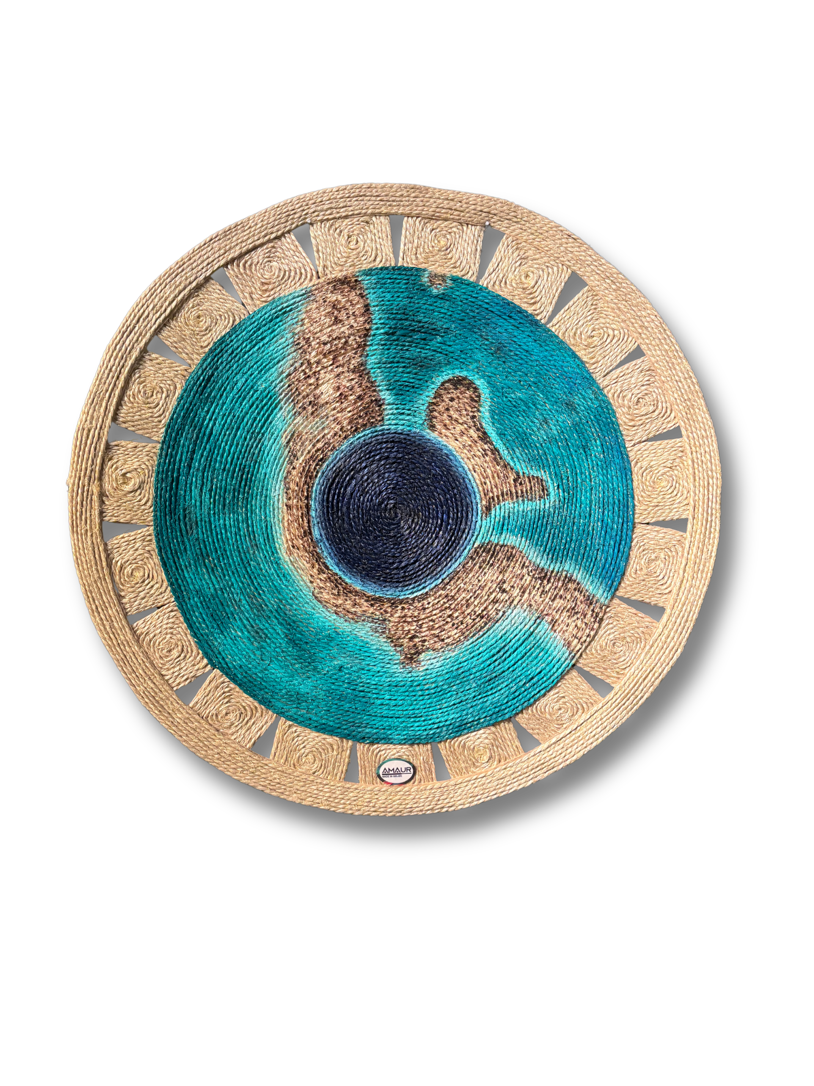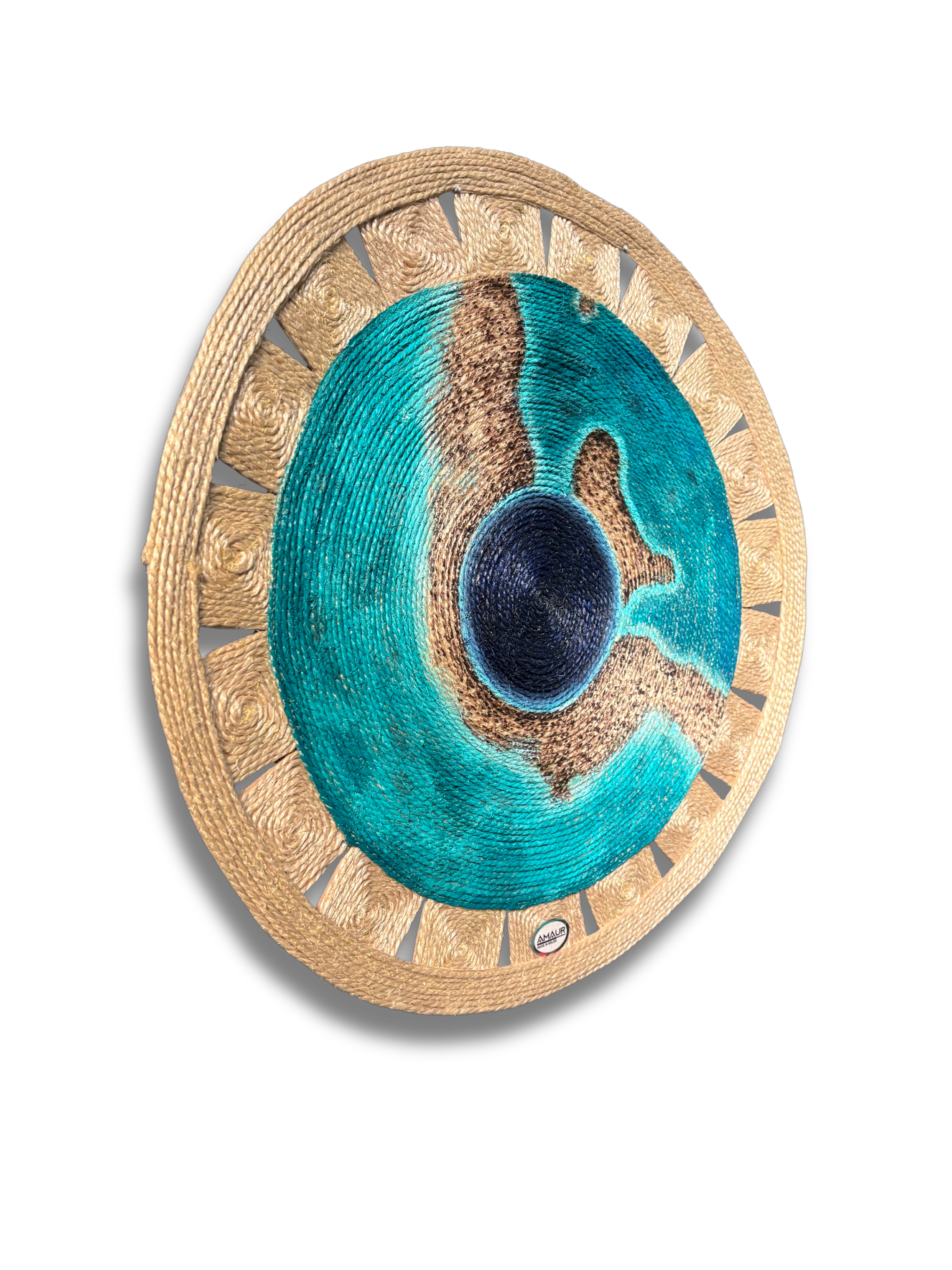 mixed media piece incorporating burlap and acrylic paint, by local artist Maureen Navarrete