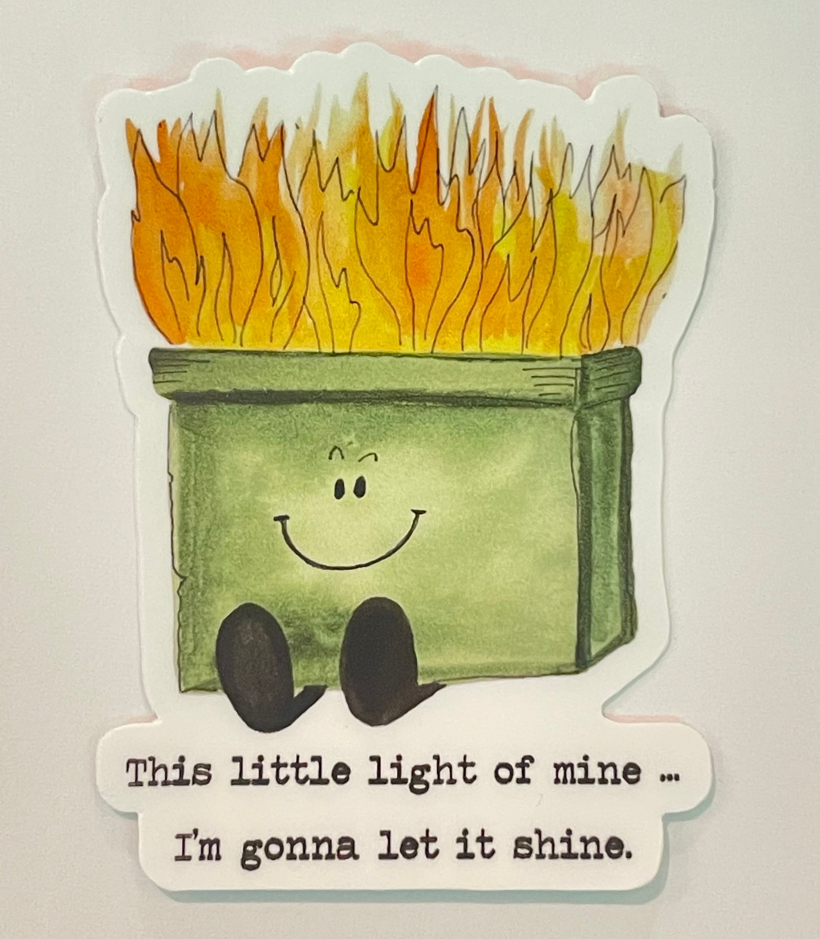 Dumpster Fire watercolor 2-1/4"x 3" die cut sticker by Gretchen Leachman. Thick, durable vinyl protects stickers from scratches, water & sunlight.