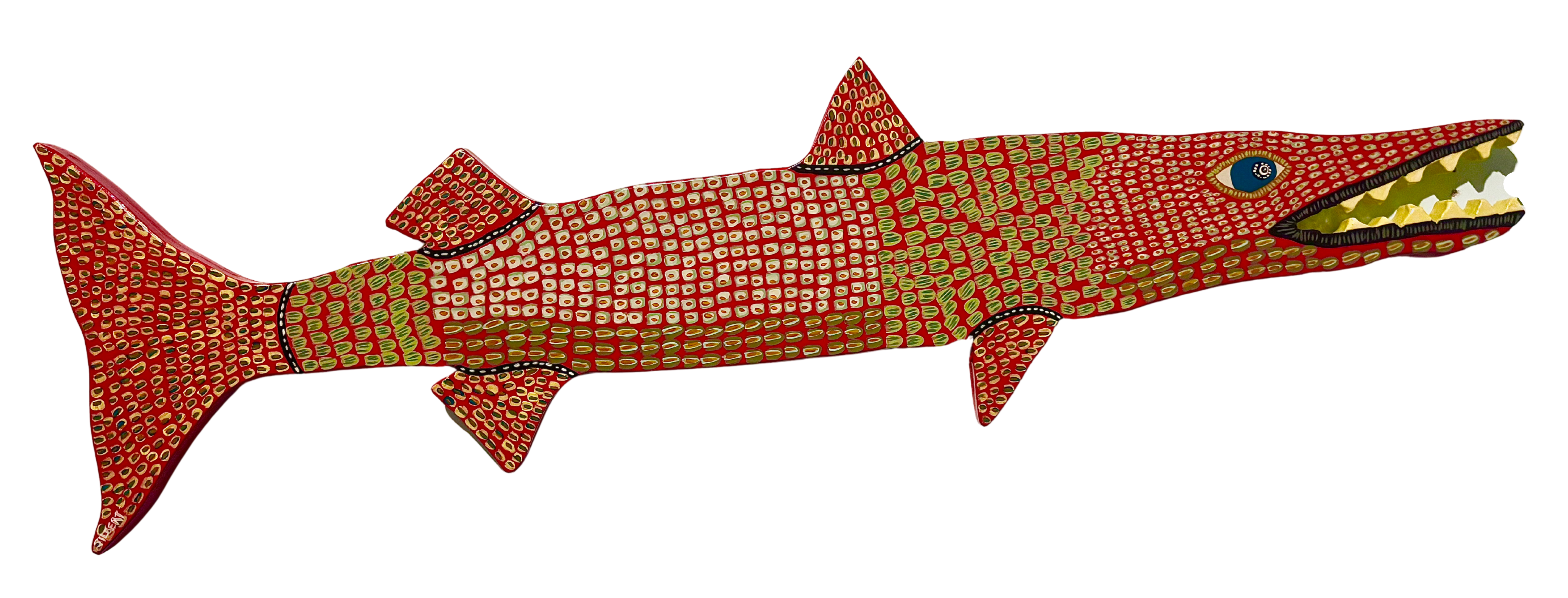 Acrylic and spray paint on 10" x 36.5" wood cut by Louisville folk artist Patrick Jilbert.