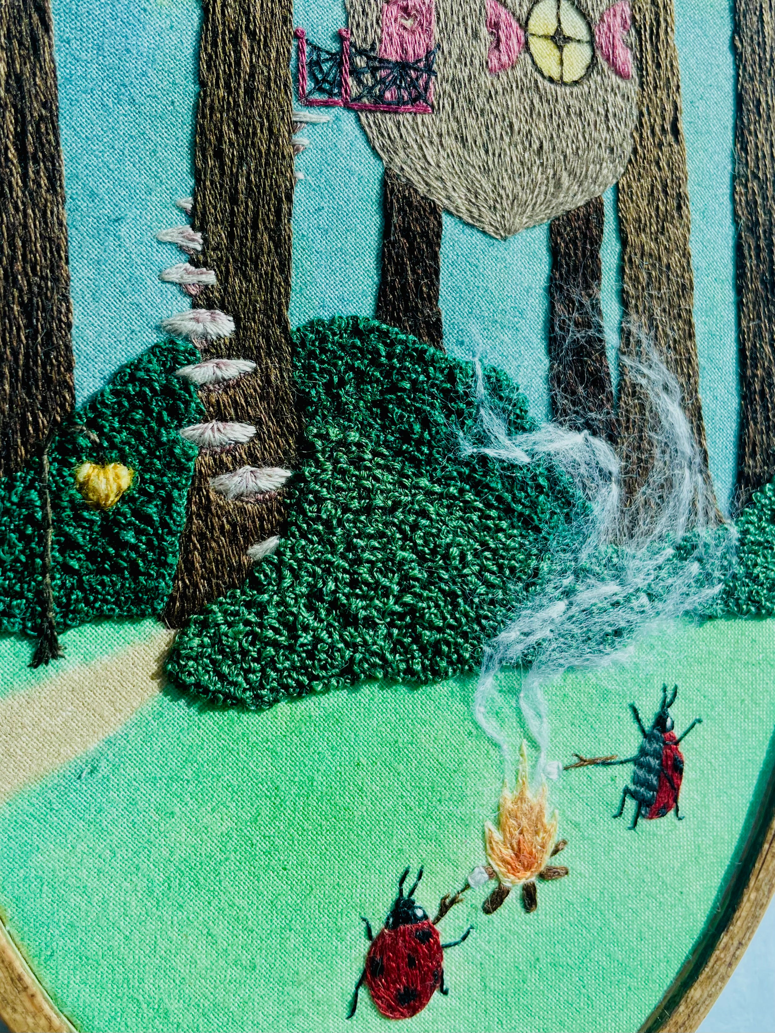 "Ladybug Date Nights : Camping", original embroidery by local artist Sarah Marie Heirlooms