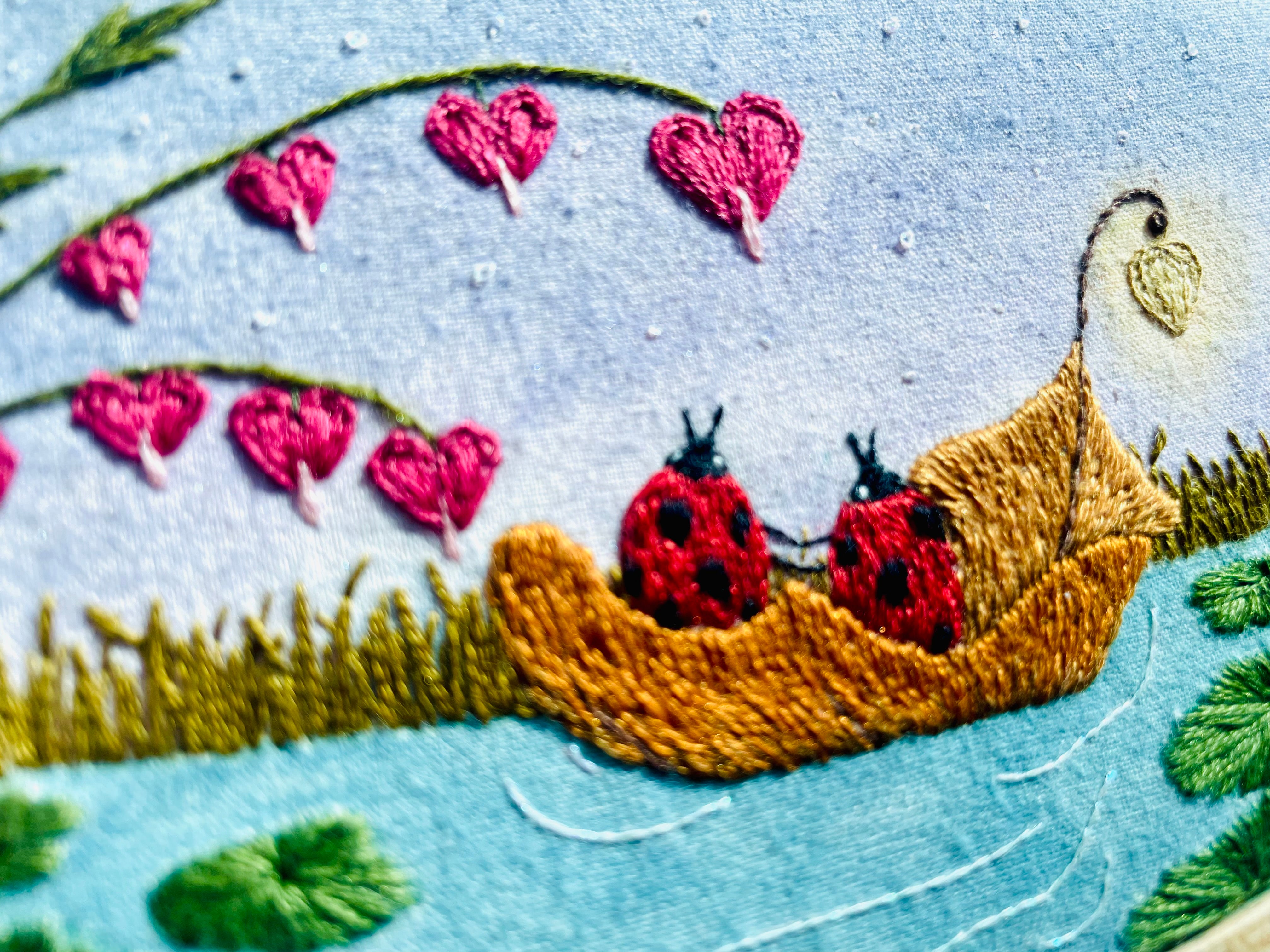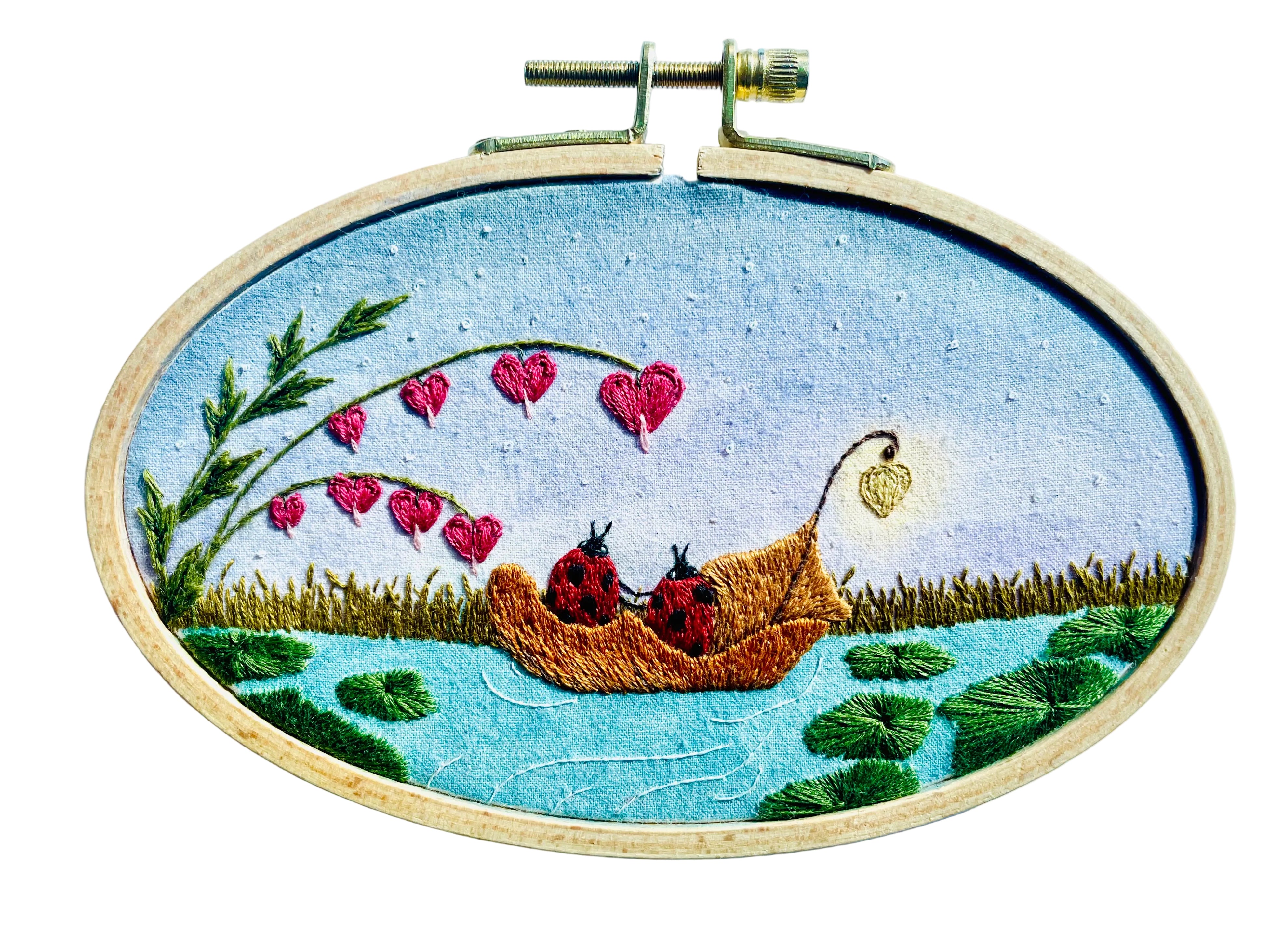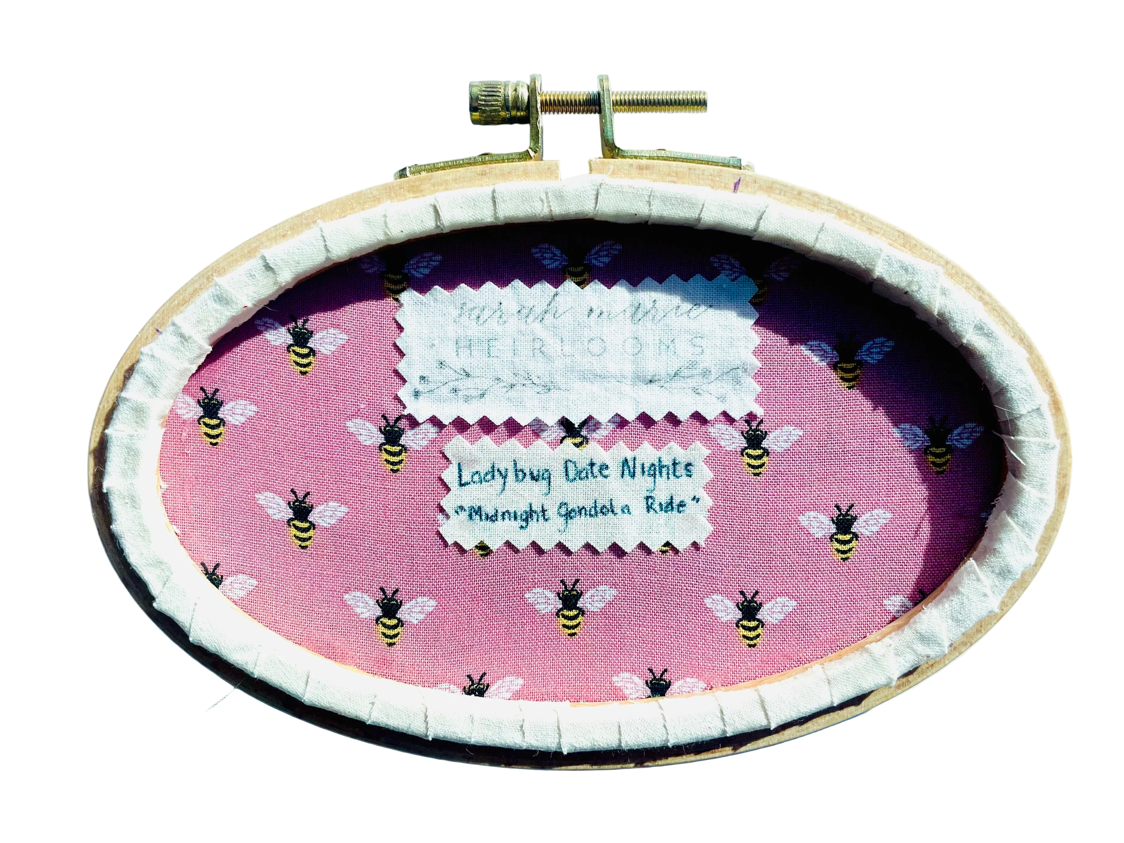 "Ladybug Date Nights : Midnight Gondola Ride", original embroidery by local artist Sarah Marie Heirlooms