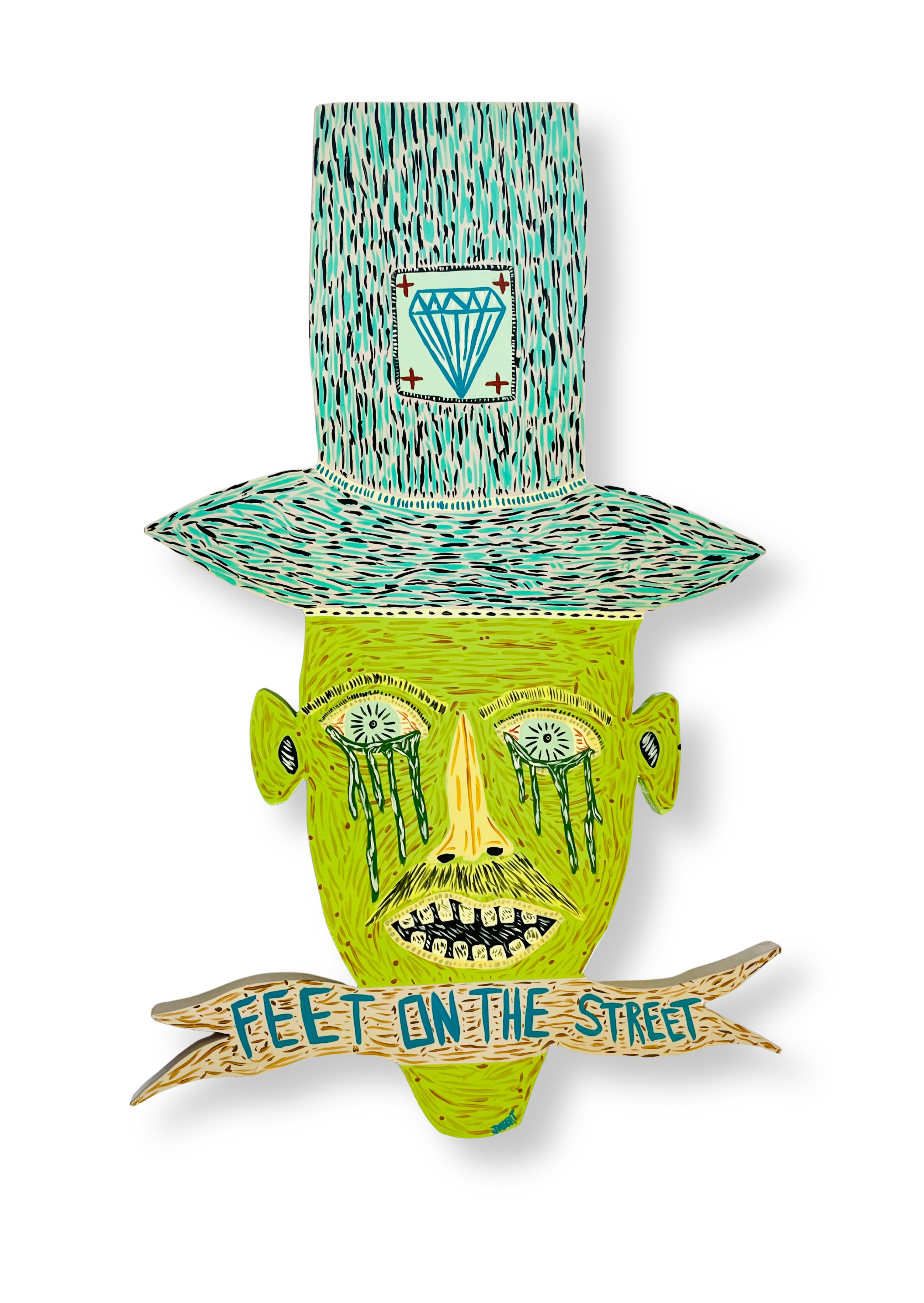 Acrylic and spray paint on 11" x 16.75" handcut wood panel by Louisville folk artist Patrick Jilbert.