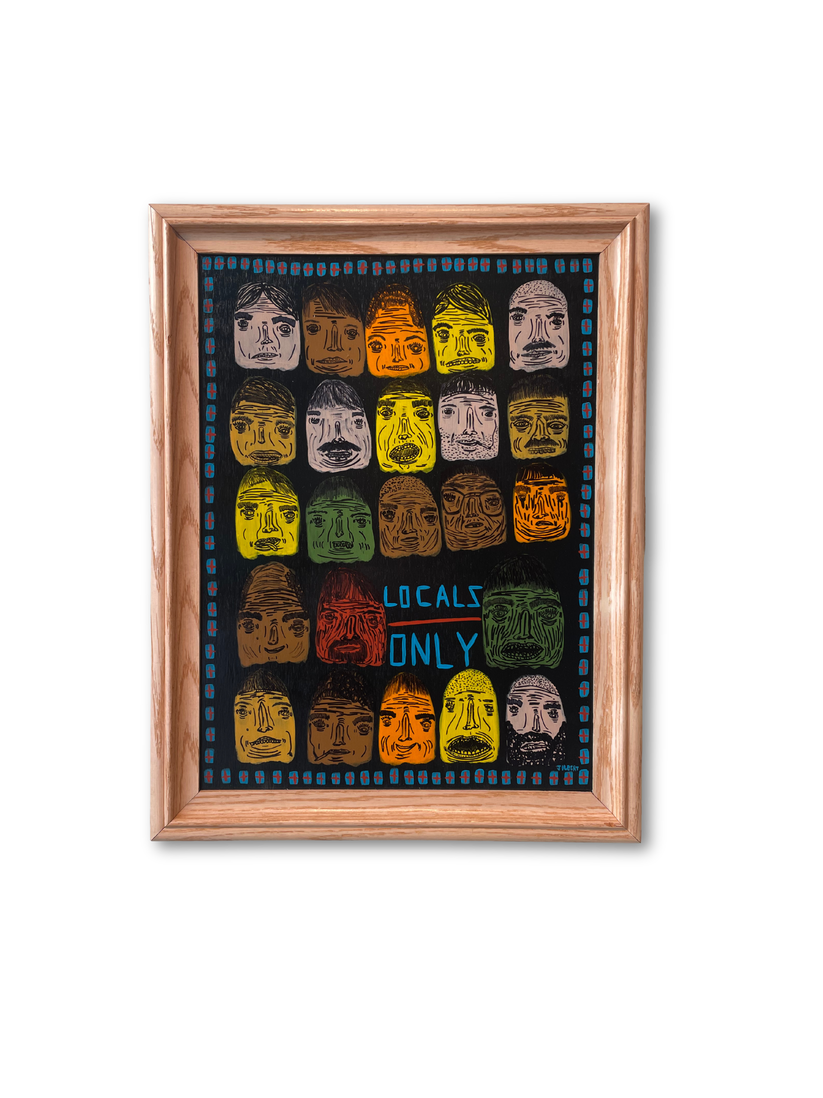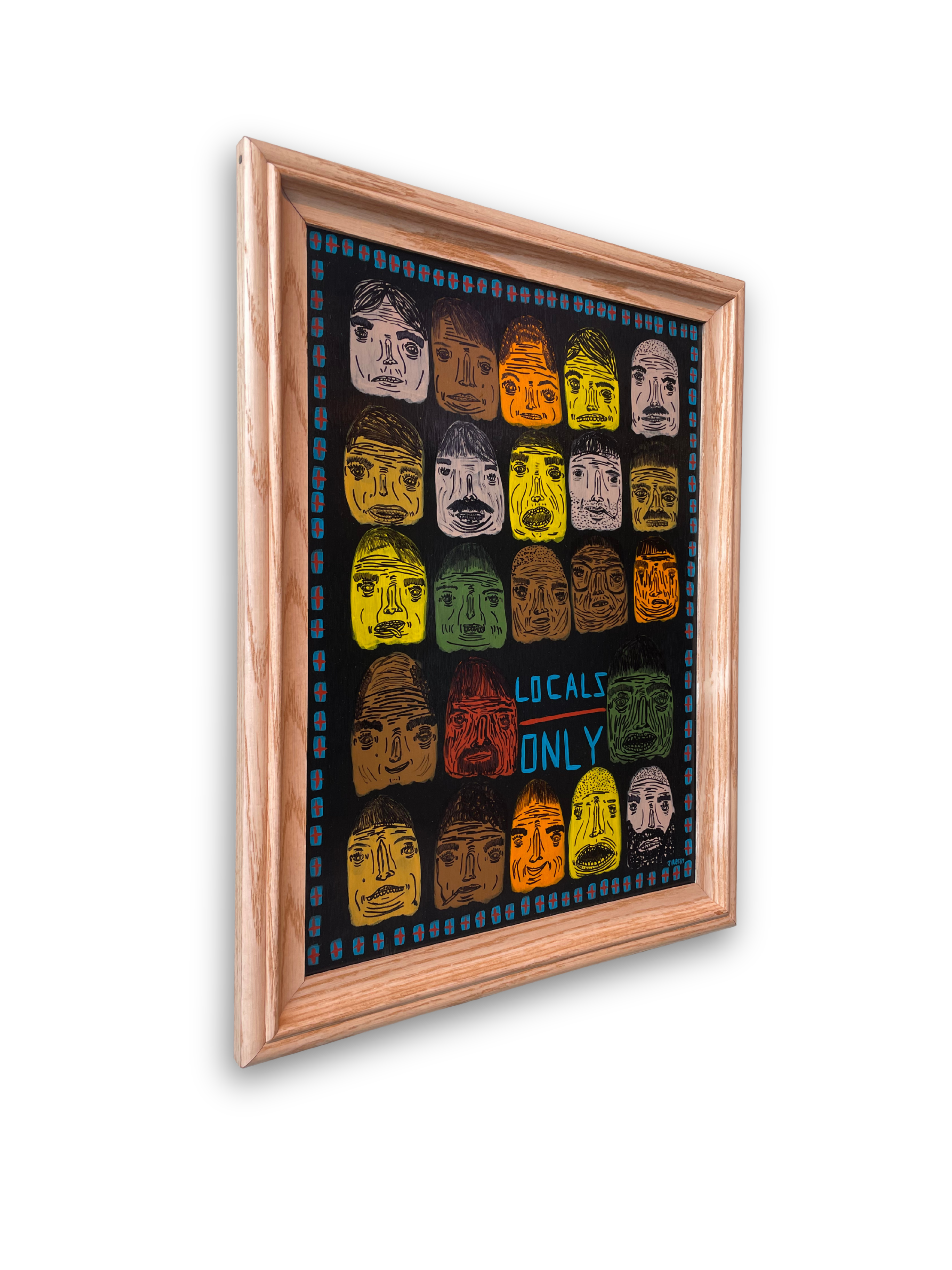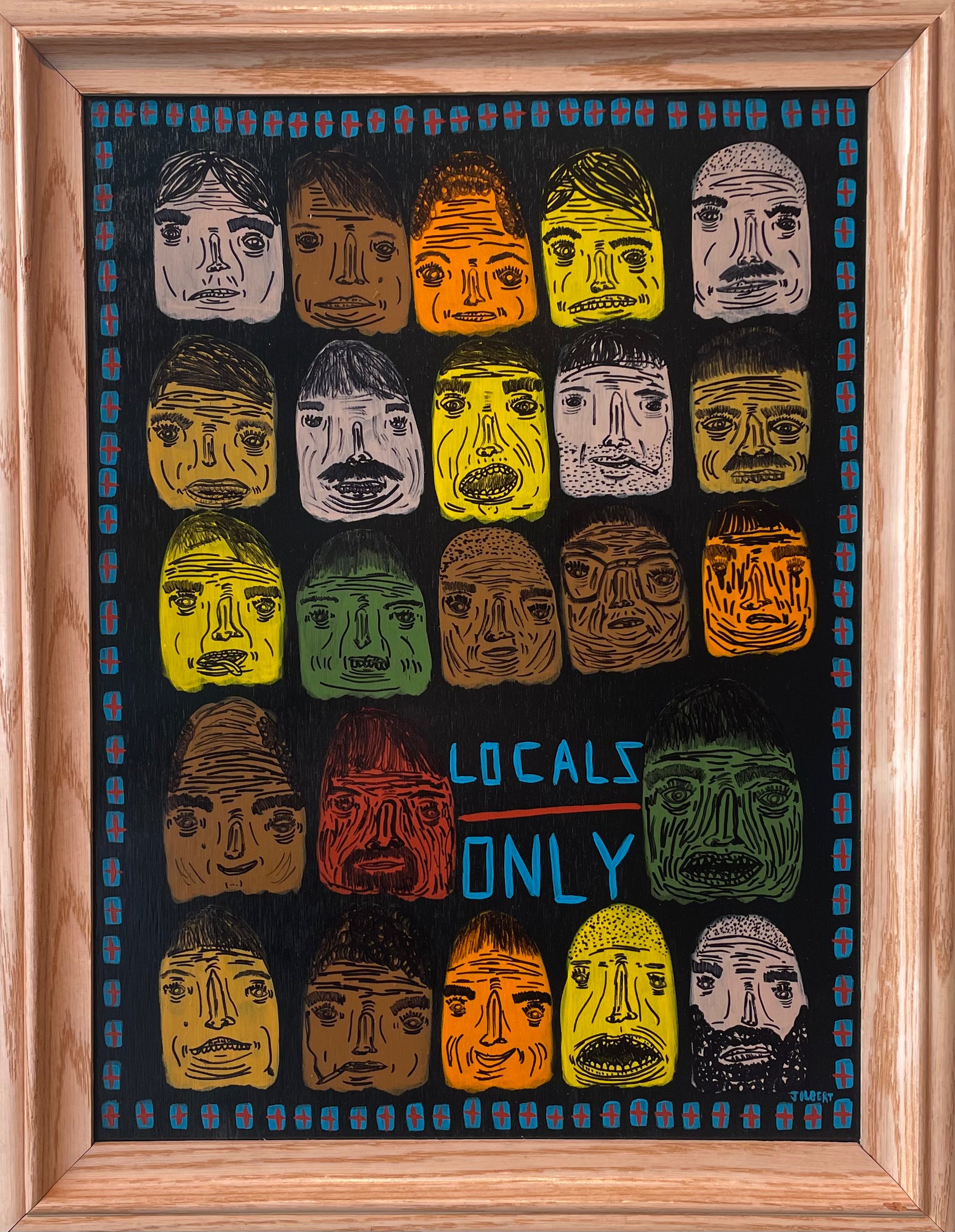 Acrylic and spray paint on 12" x 16" handcut wood panel by Louisville folk artist Patrick Jilbert.