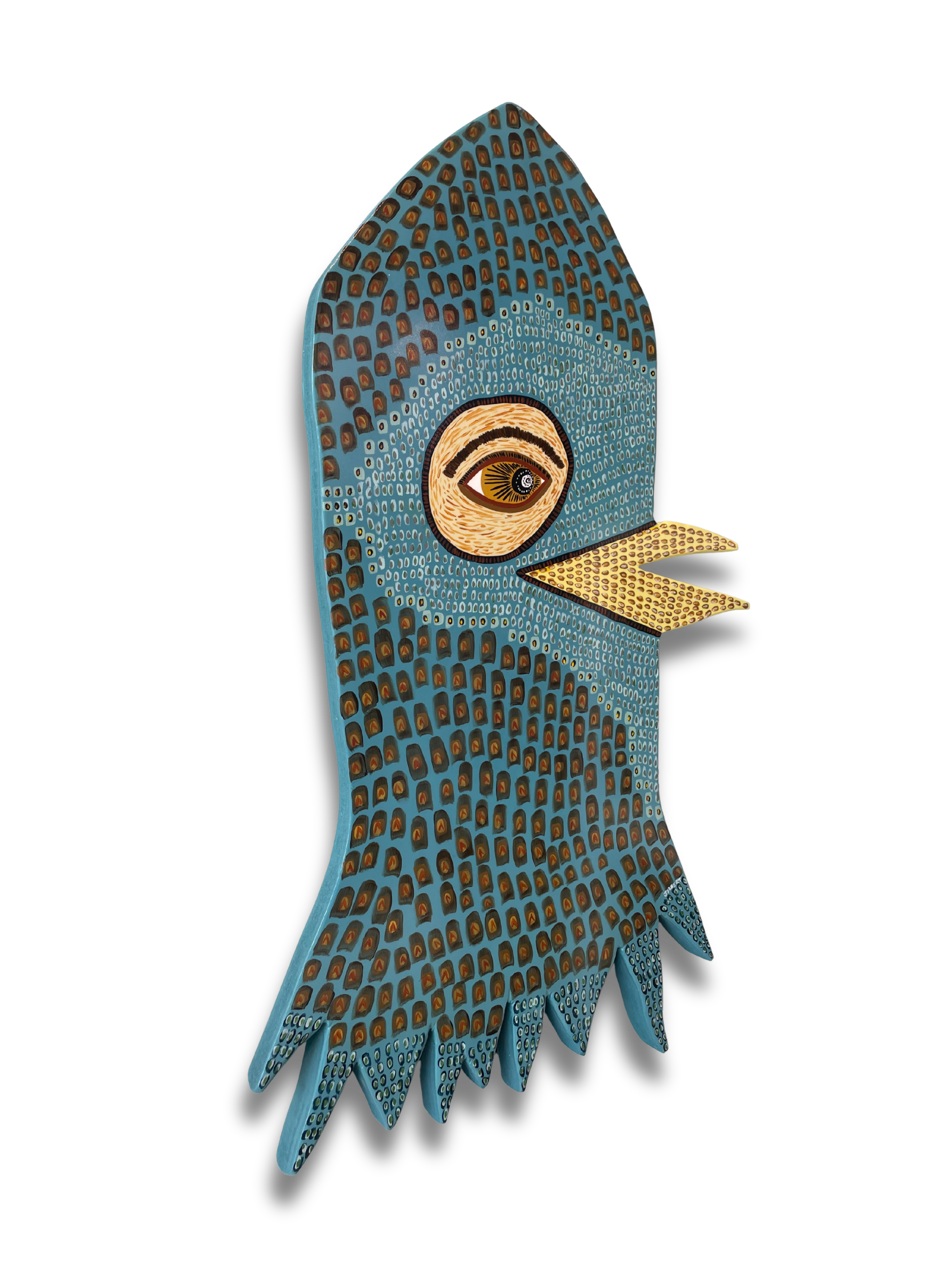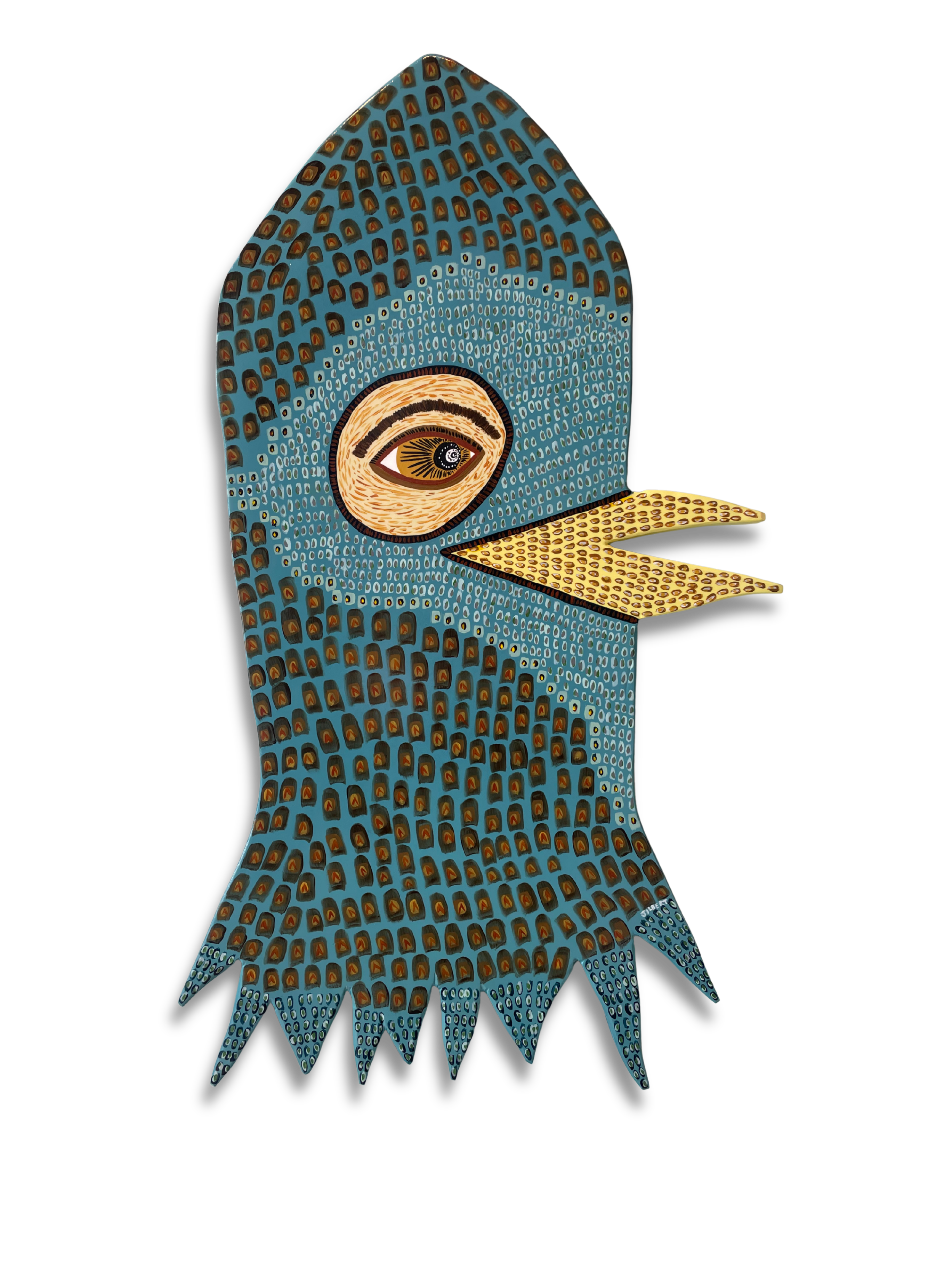 Acrylic and spray paint on 16" x 27.5" handcut wood panel by Louisville folk artist Patrick Jilbert.