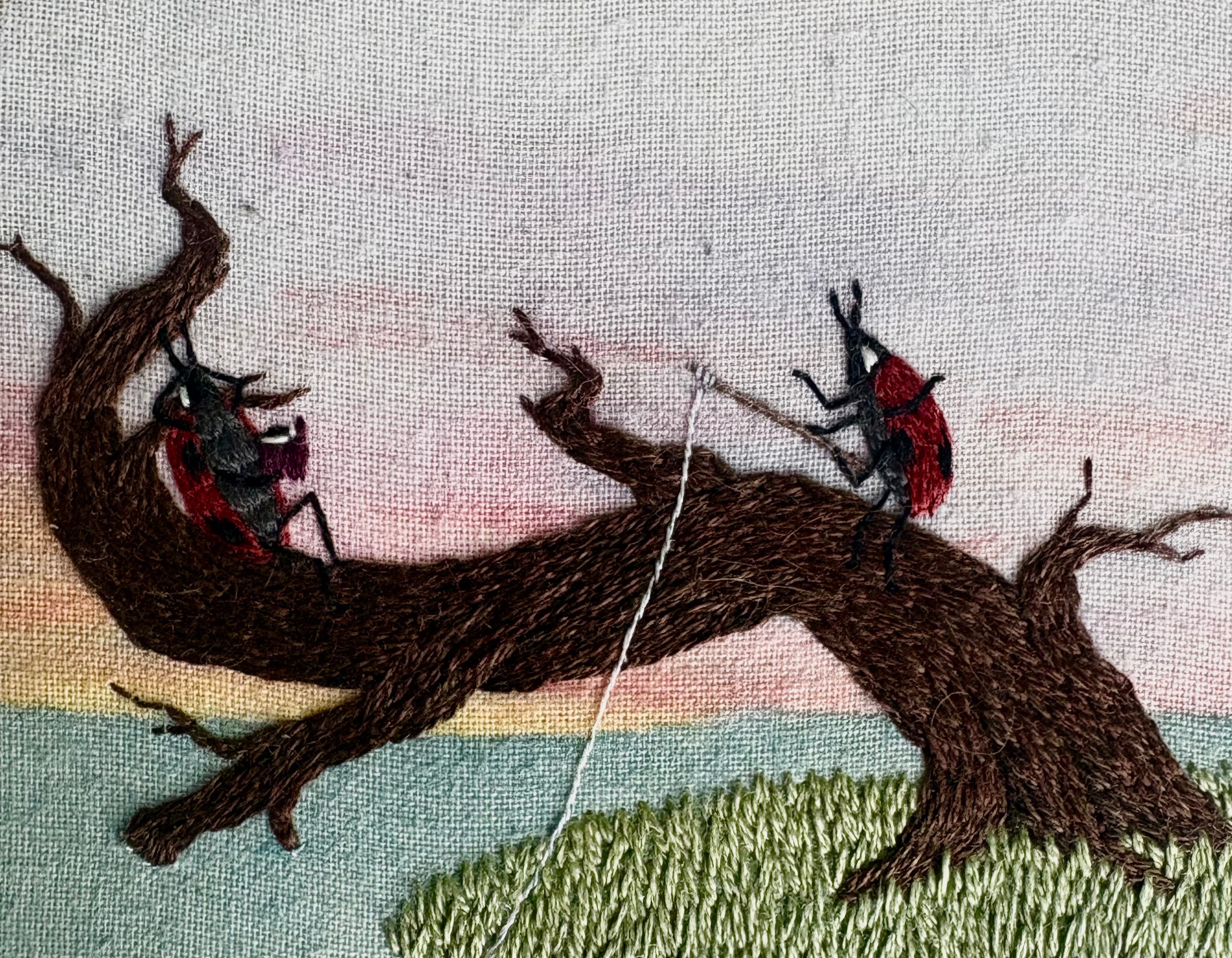 "Ladybug Date Nights : Out Fishing", original embroidery by local artist Sarah Marie Heirlooms