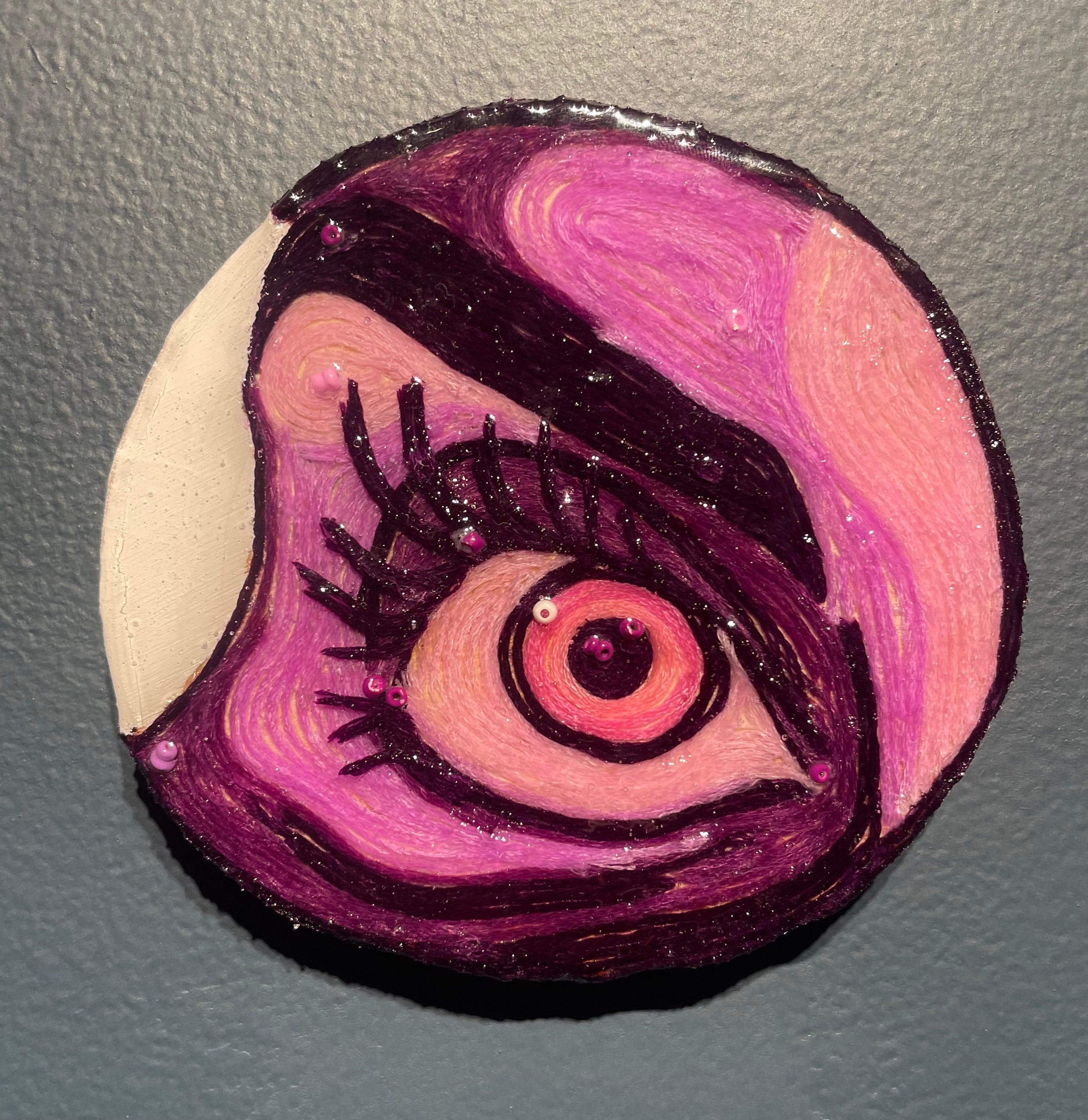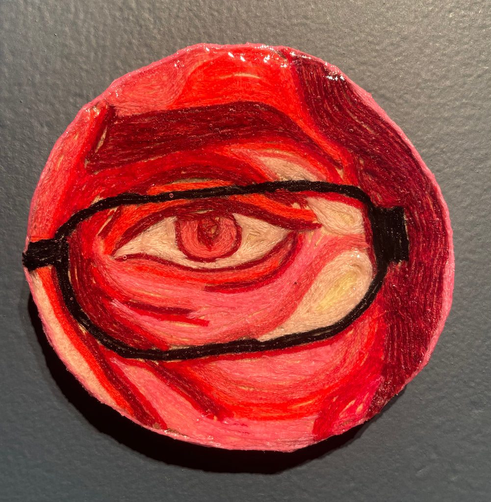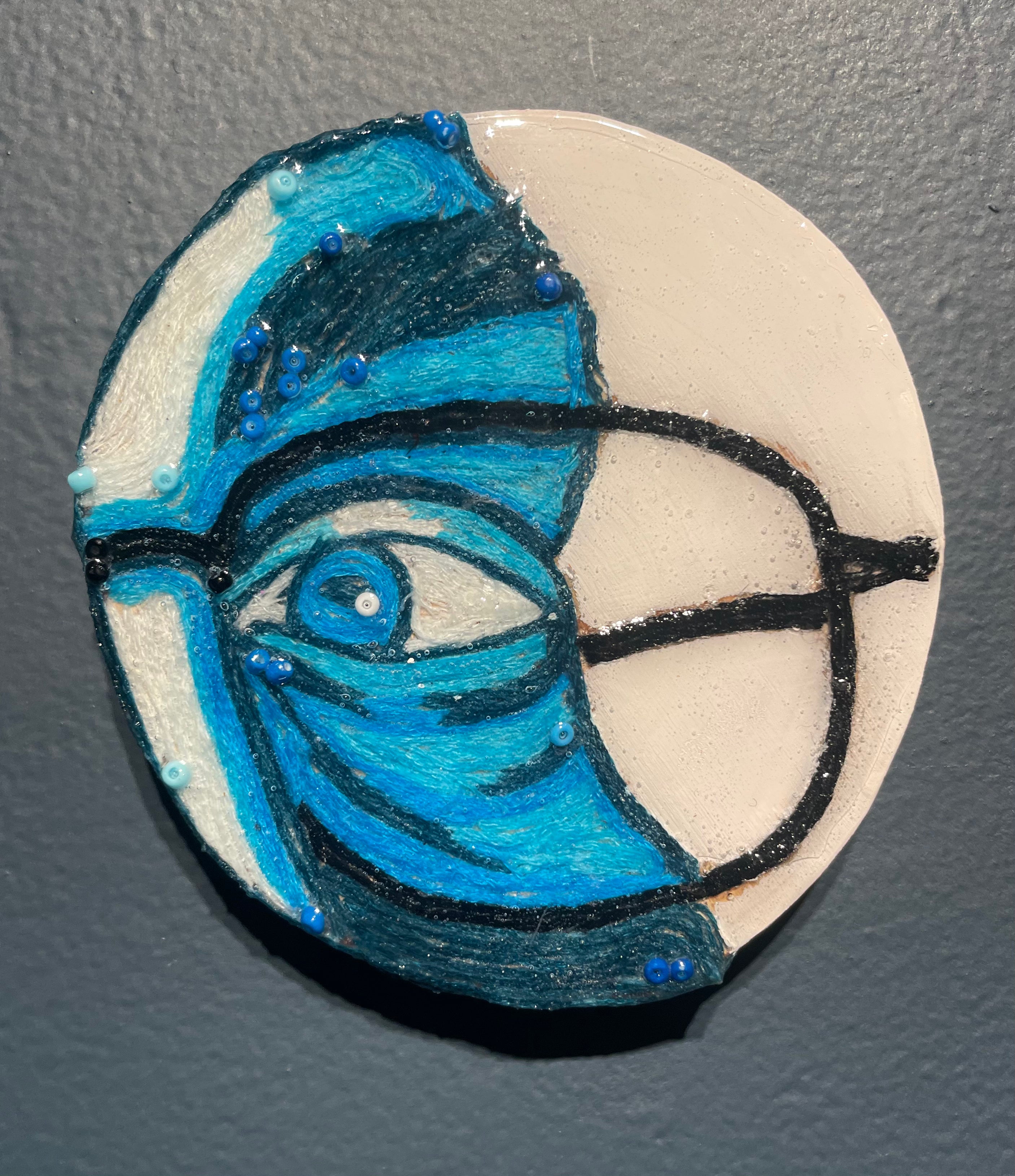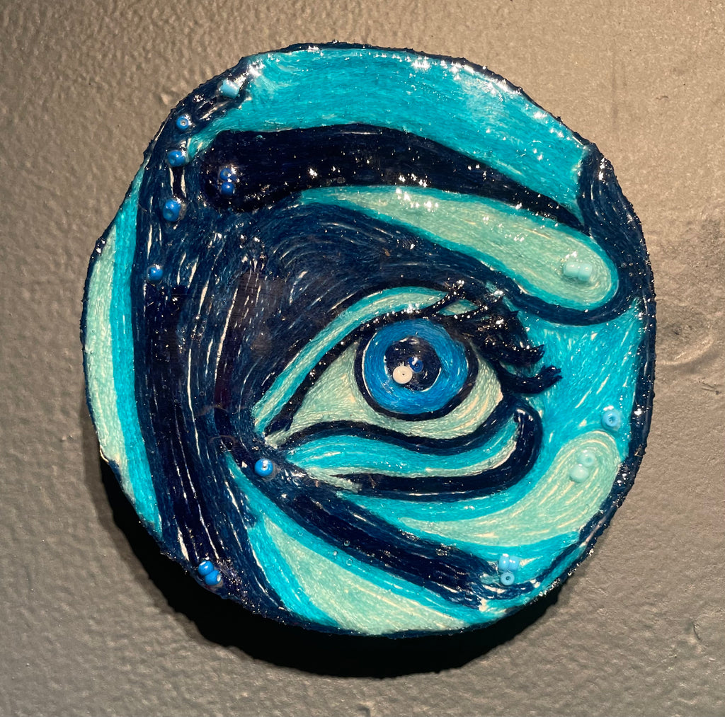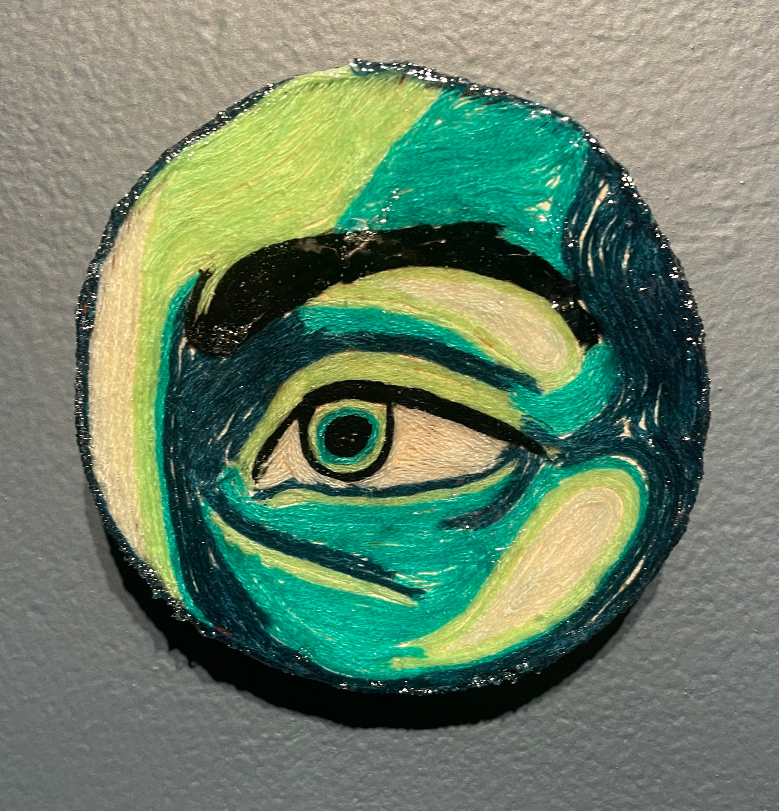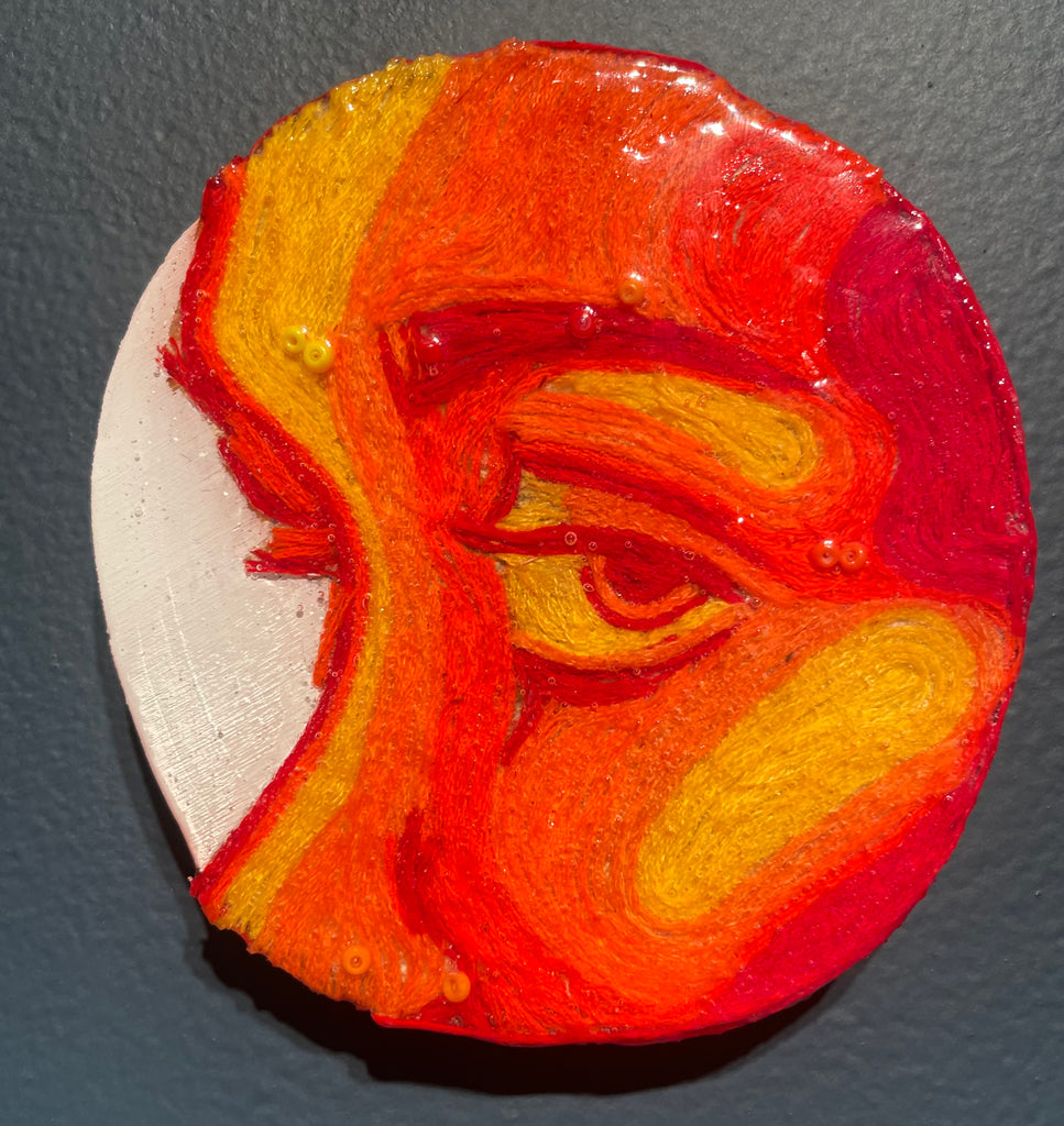 Glimpses; a series of studies using thread or paint on wood and sealed with a layer of resin; by local artist Needa Hameed