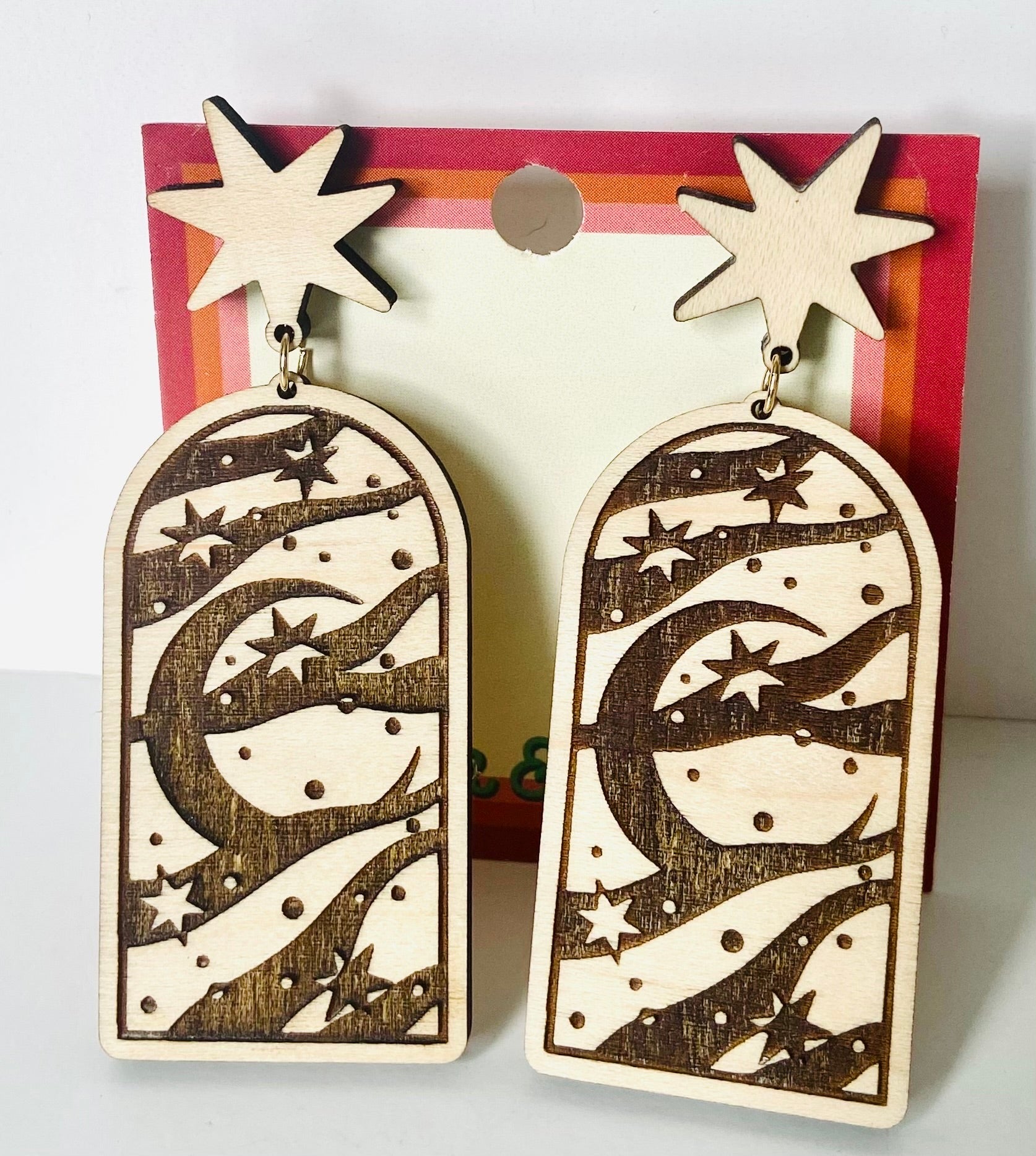 Laser-etched wood post earrings, by local artist Slate & Stone