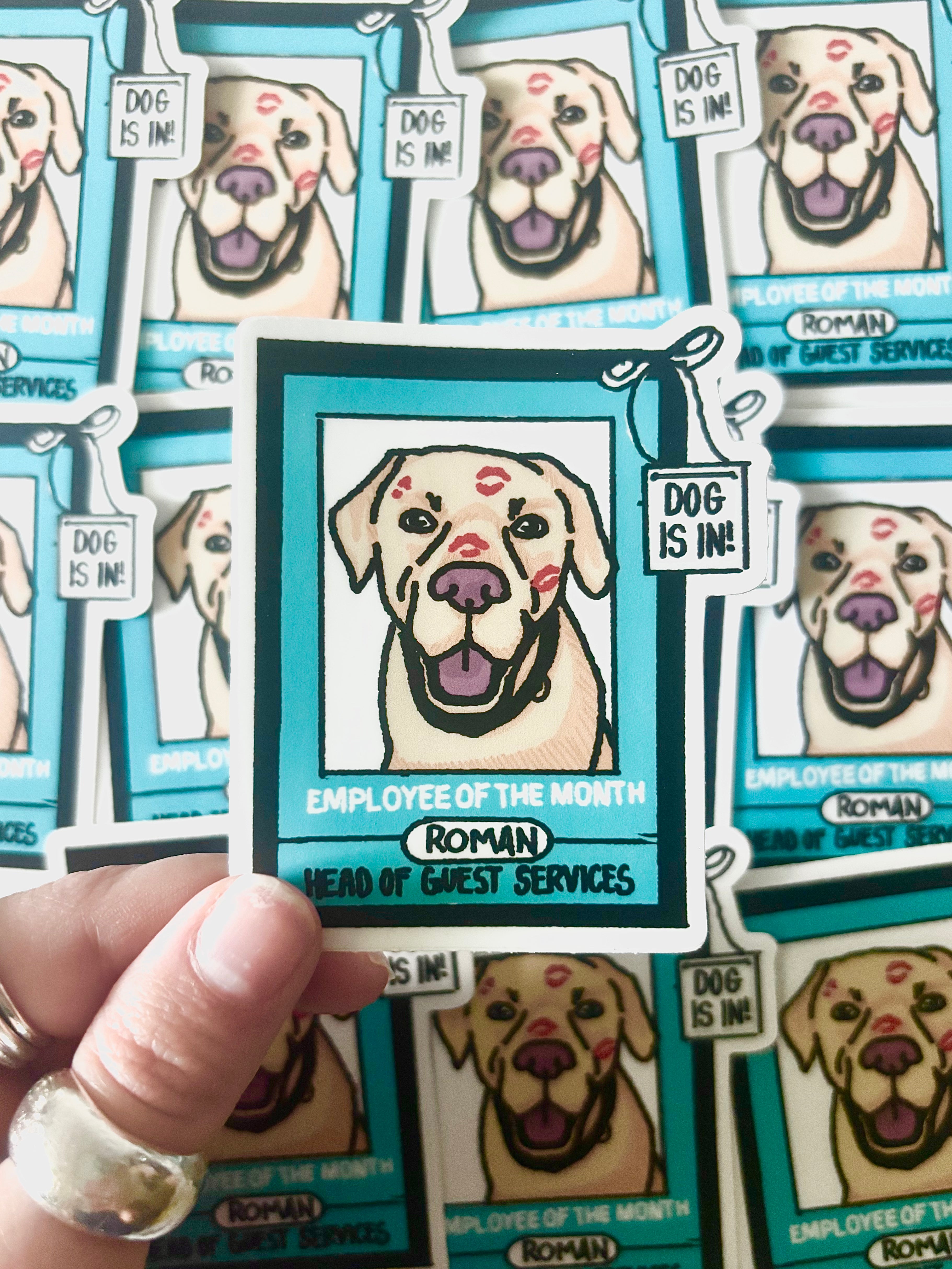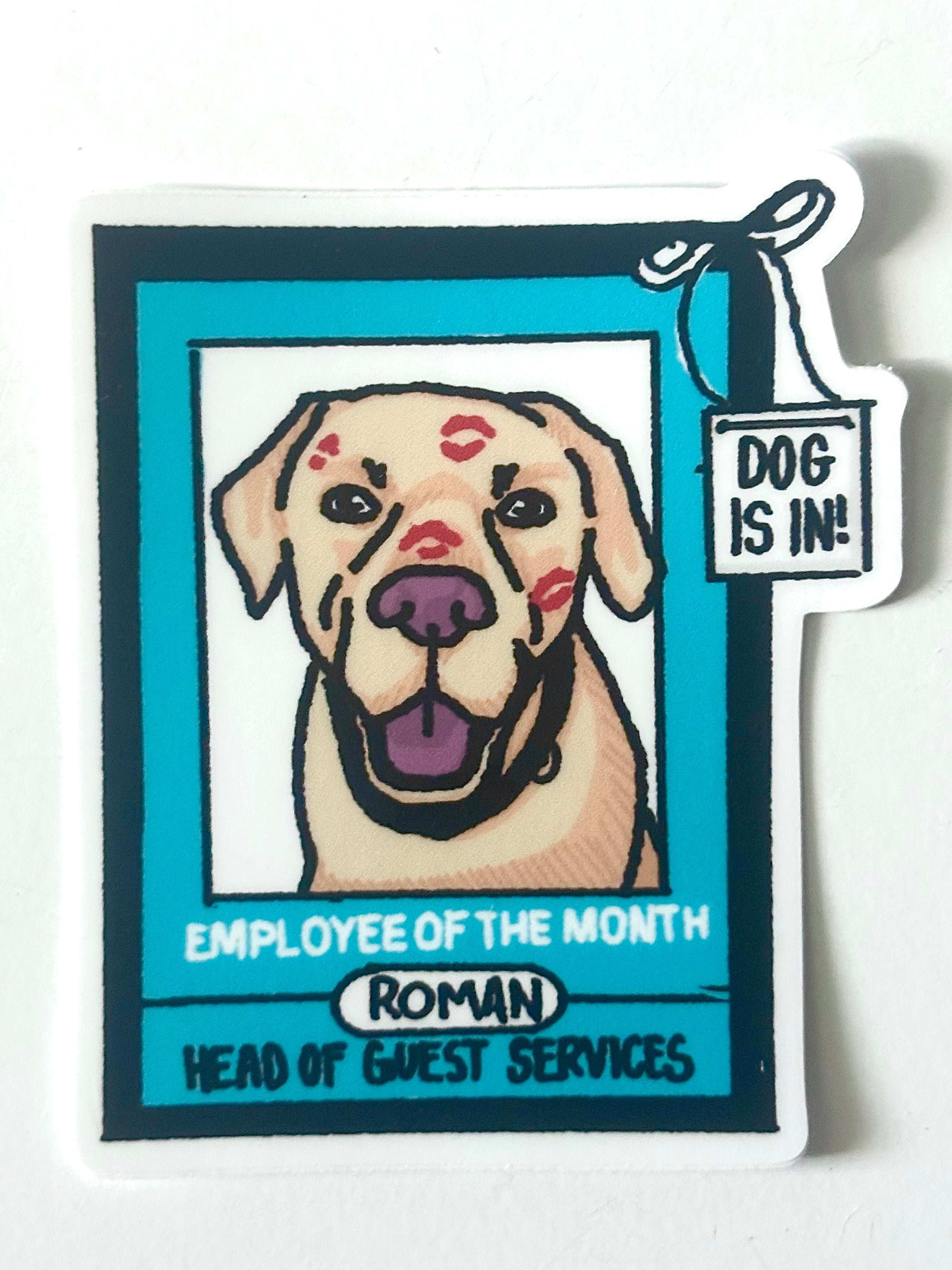 Die-cut sticker of Revelry's beloved (and permanent!) Employee of the Month and Head of Guest Services!