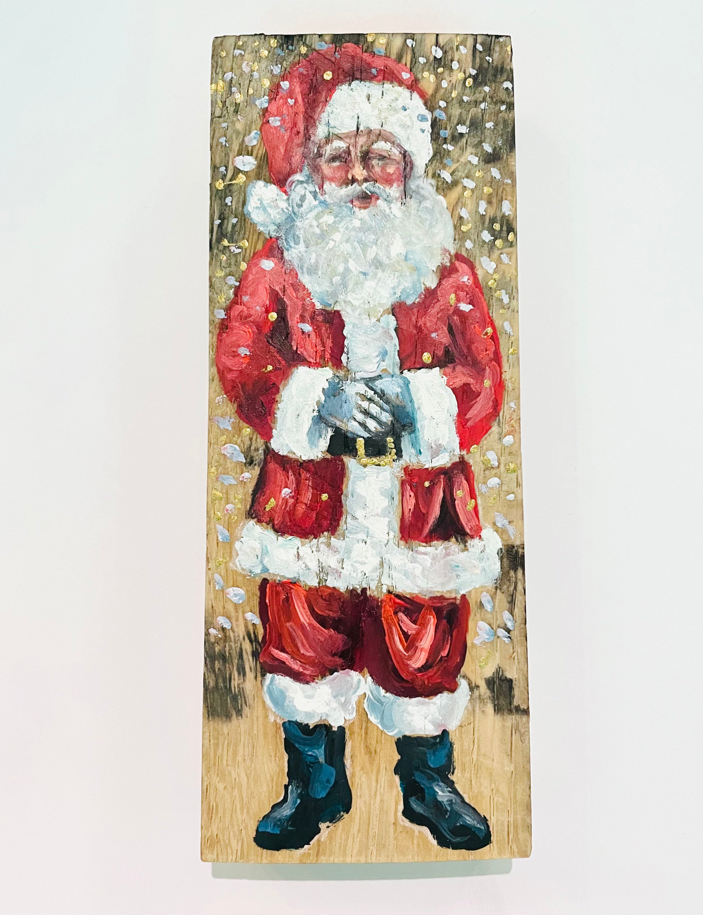 Hand painted with oils on a bourbon stave, Santa is brought to life by local artist Susan Howe!