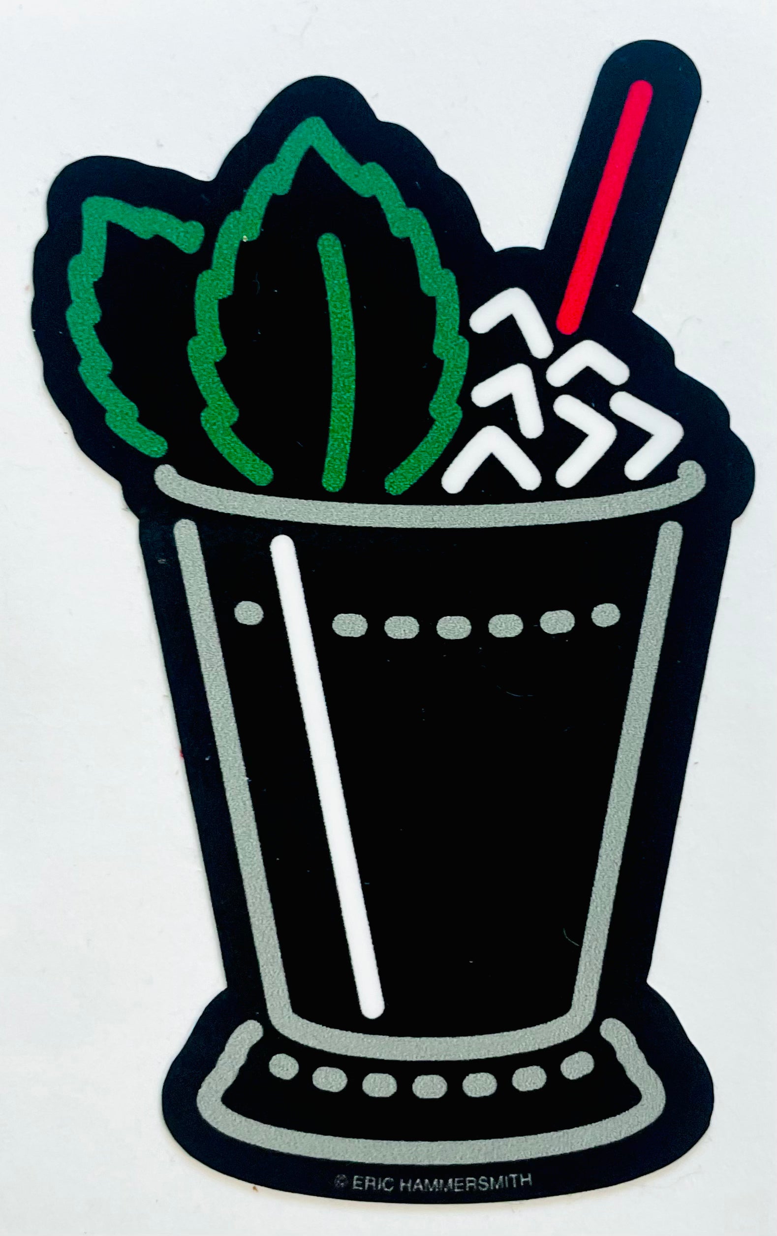 Vinyl sticker of a neon mint julep cup, by local artist Eric Hammersmith