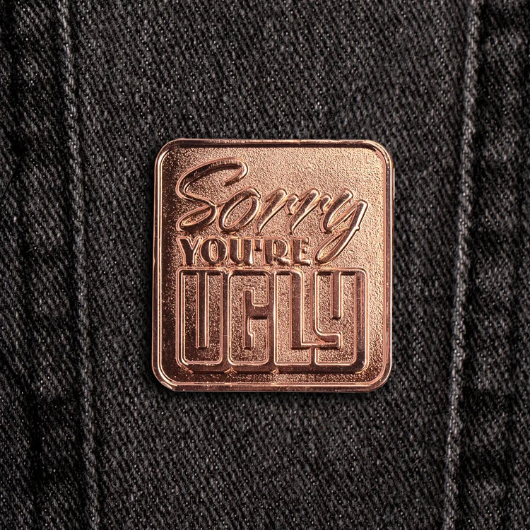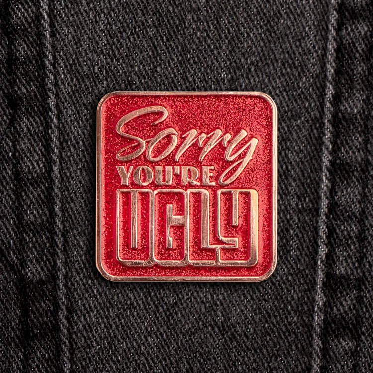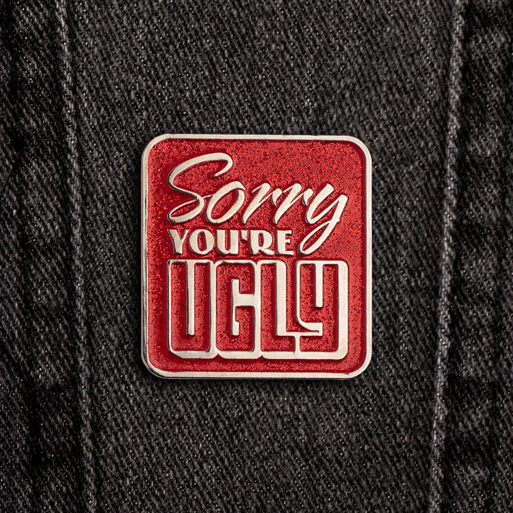 AngryBlue - Sorry You're Ugly Pins - Nickel Red Glitter is backordered and will ship as soon as it is back in stock.