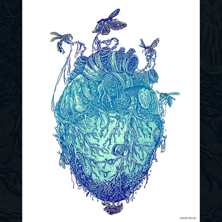 This human heart illustration is consumed by roots and crawling with or built by delicate insects. It’s a quiet reminder that life and decay are always entangled. Originally done as a larger limited edition poster that has long since sold out. You can also find a version of this design in letterpress form under ‘Small Prints’.