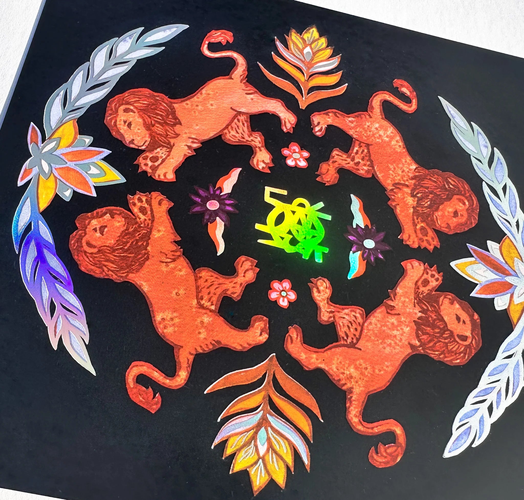 Full bleed digital print of original mixed media artwork with holographic foil embellished details, by local artist Irene Mudd.