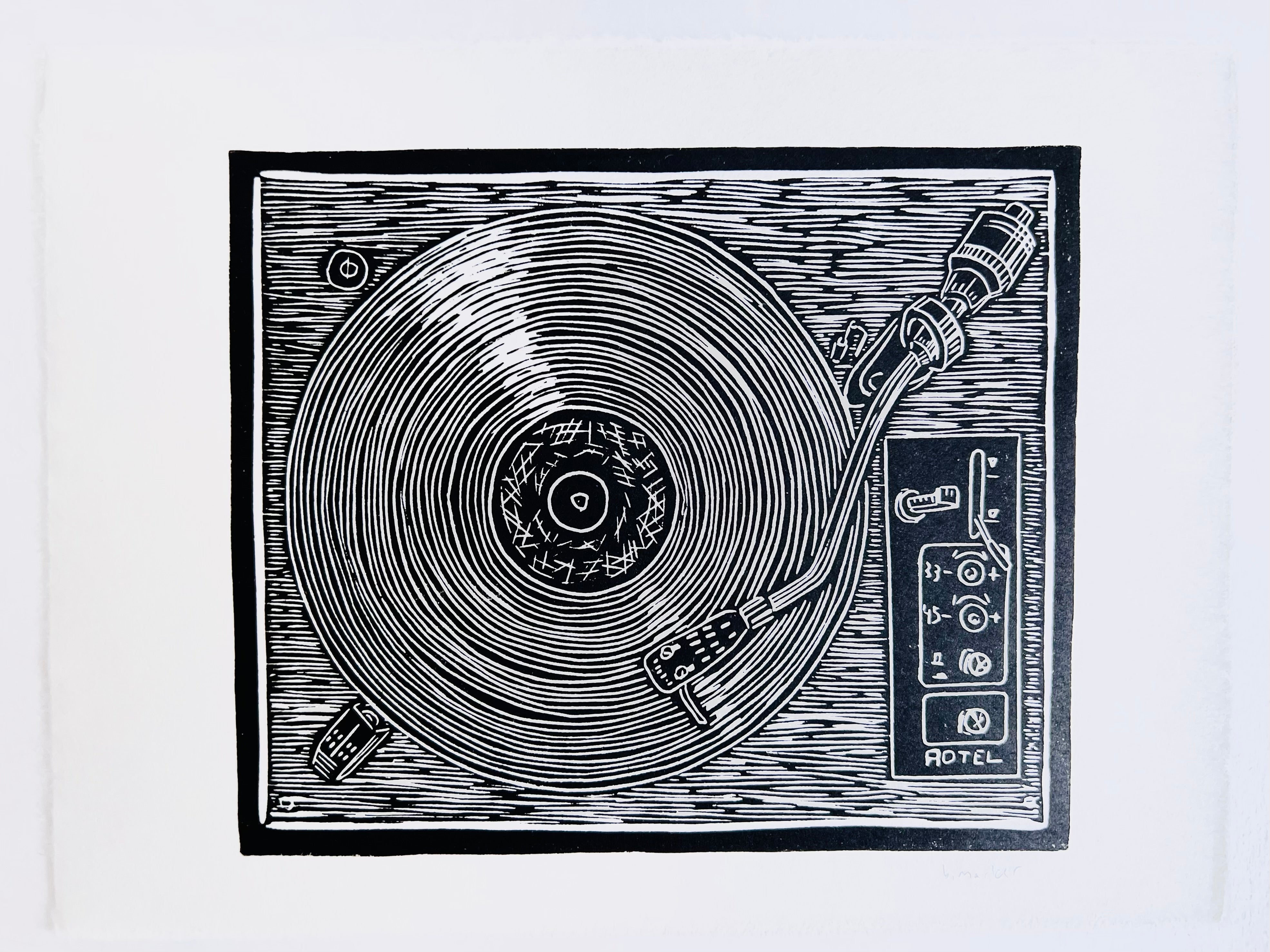 Handmade Lino-Cut Print by Louisville Artist House of Figs Studio. Featuring a record player design.