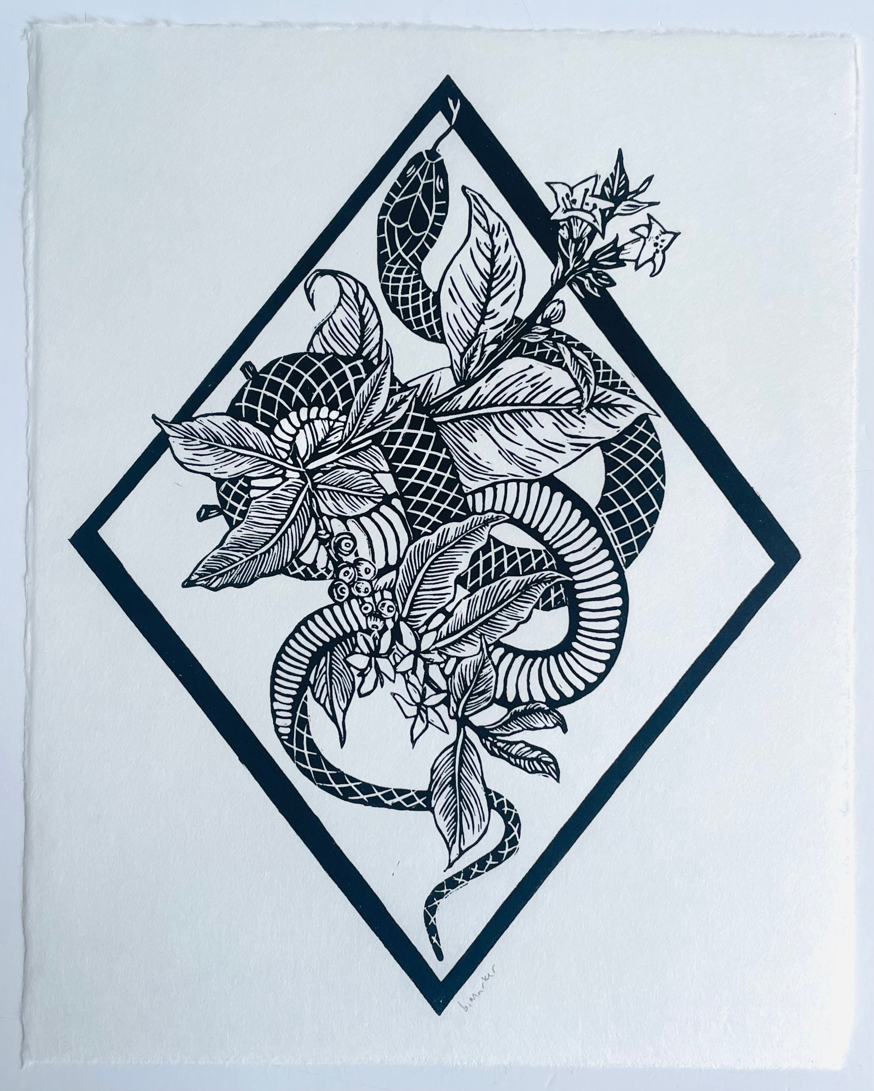 Handmade Lino-Cut Print by Louisville Artist House of Figs Studio. Featuring a snake and botanical elements within a diamond shape.